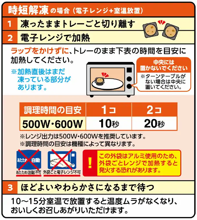 ■時短解凍(電子レンジ+室温放置):ラップをかけずに500W/600W 10秒加熱後、10~15分程度待つ |