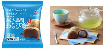 本わらび粉と沖縄県産黒糖を配合したわらび餅で、なめらかなこしあんを包み香ばしい京きなこをまぶしました。 |