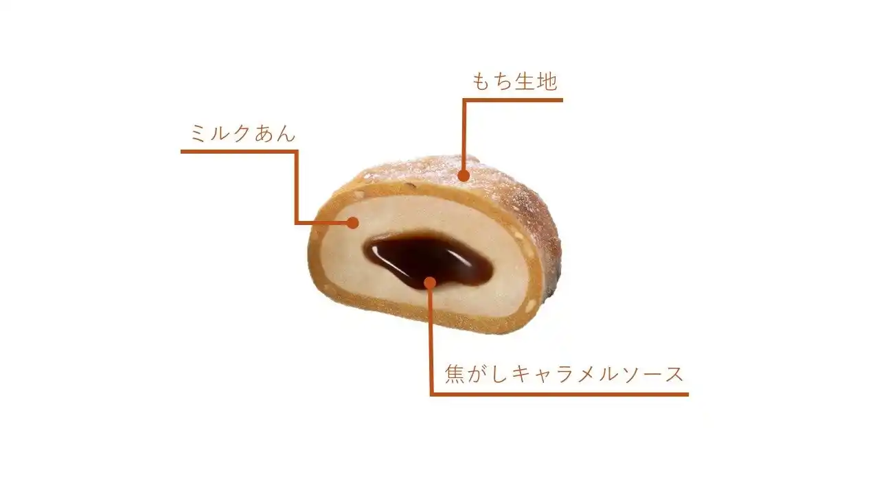 ミルクあんと焦がしキャラメルソースを堪能いただくために、重量比率の半分以上があんとソースになっています。こだわりのもち生地とたっぷりのミルクあん、そして焦がしキャラメルソースのバランスをお楽しみください。 |