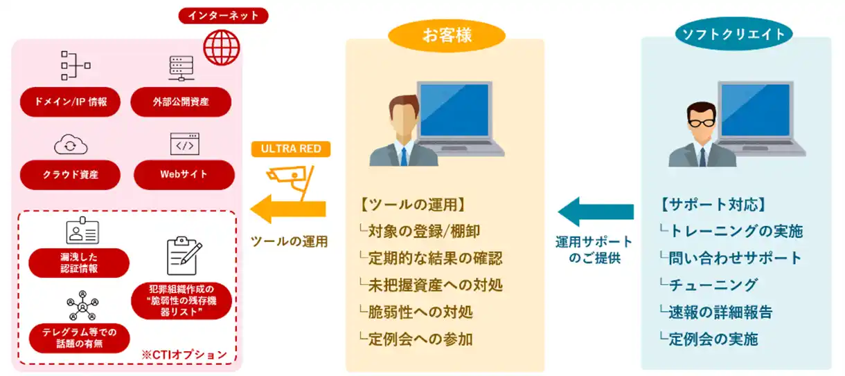 ソフトクリエイトでは、「SCSmart ULTRA RED」として、ULTRA REDの運用サポートサービスをご提供しています。SOCや各種セキュリティ診断で培った経験に加え、「SCSmart ASM」サービスを通じて蓄積した豊富なノウハウを活かし、経験豊富なソフトクリエイトの技術者が、お客様の運用環境に合わせて具体的なアドバイスや脆弱性に関する詳細なご報告を継続的に行います。セキュリティ人材不足などによる運用課題を支援します。 |