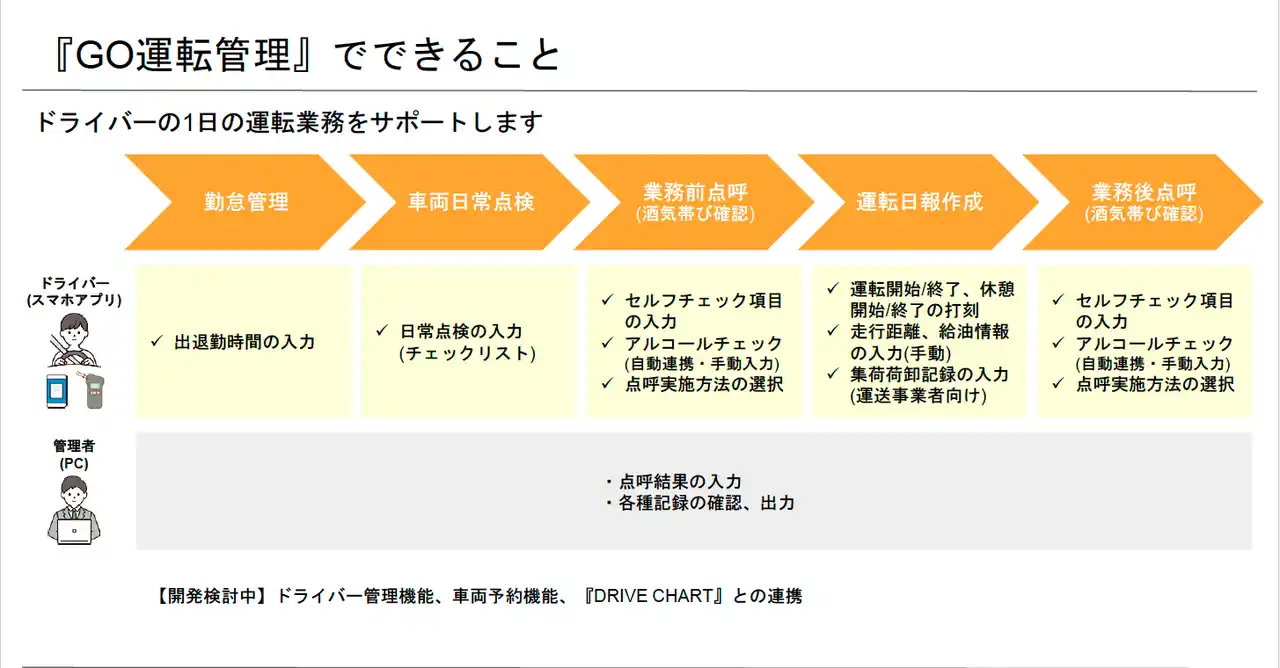 GOドライブ株式会社(本社:東京都港区、代表取締役社長:川上 裕幸)は、業務用車両における点呼・アルコールチェック・日報作成をスマートフォンアプリで簡単にできる新サービス『GO運転管理』を2025年8月26日(火)より開始します。当社が提供する次世代AIドラレコサービス『DRIVE CHART』の導入企業のうち一部事業者様においては、本サービスを今年3月より先行導入いただいております。大手物流企業やサービス業など幅広い業界の業務用車両管理現場で実際に活用されており、すでに11社合計15,000以上のユーザー(管理者・ドライバー)による活用を見込んでおります。 |