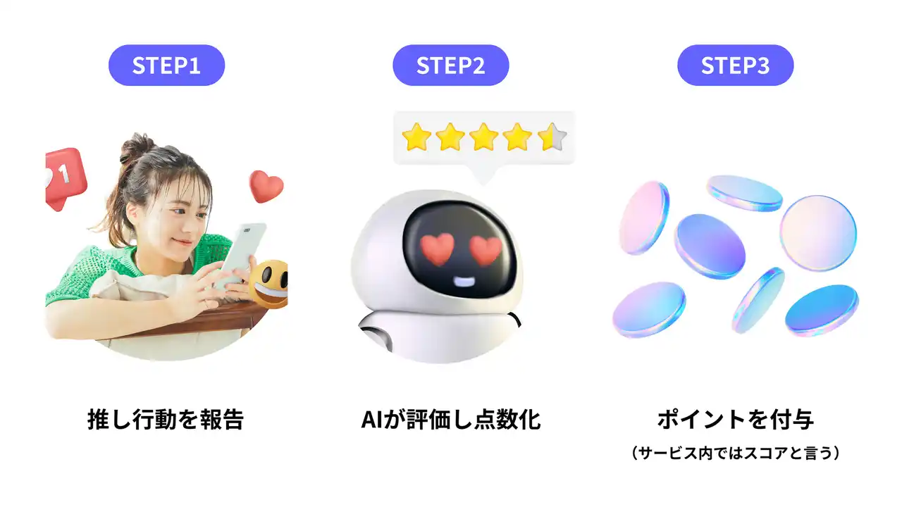 本手法は、企業が推し行動(商品・ブランドの応援につながる行動)を定義し、その行動の貢献度をAIが定性評価を含めて数値化し、貢献度に応じてスコア(ポイント、以下スコア)を付与する仕組みです。広告に依存せず、企業と顧客の関係性の中で成果を生み出す新しいマーケティング手法です。 |