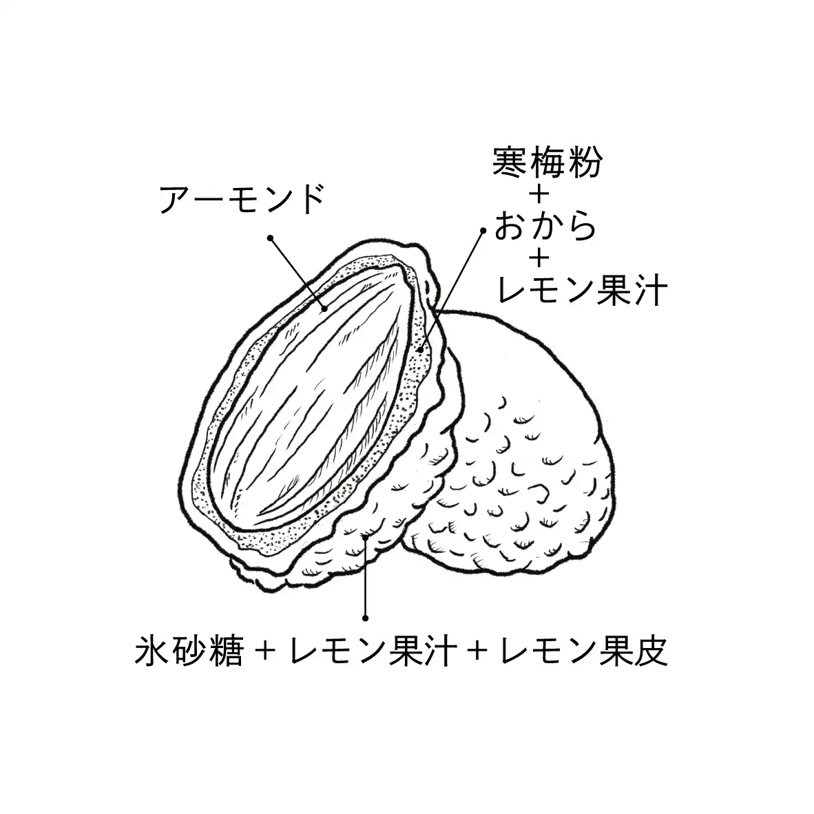 | おからパウダーと寒梅粉(もち米の粉)、レモン果汁の生地でアーモンドを包み、カリカリに煎ったのちに、氷砂糖、レモン果皮、果汁で味付けされた豆菓子は、たまらない食感と無添加の優しい味 |