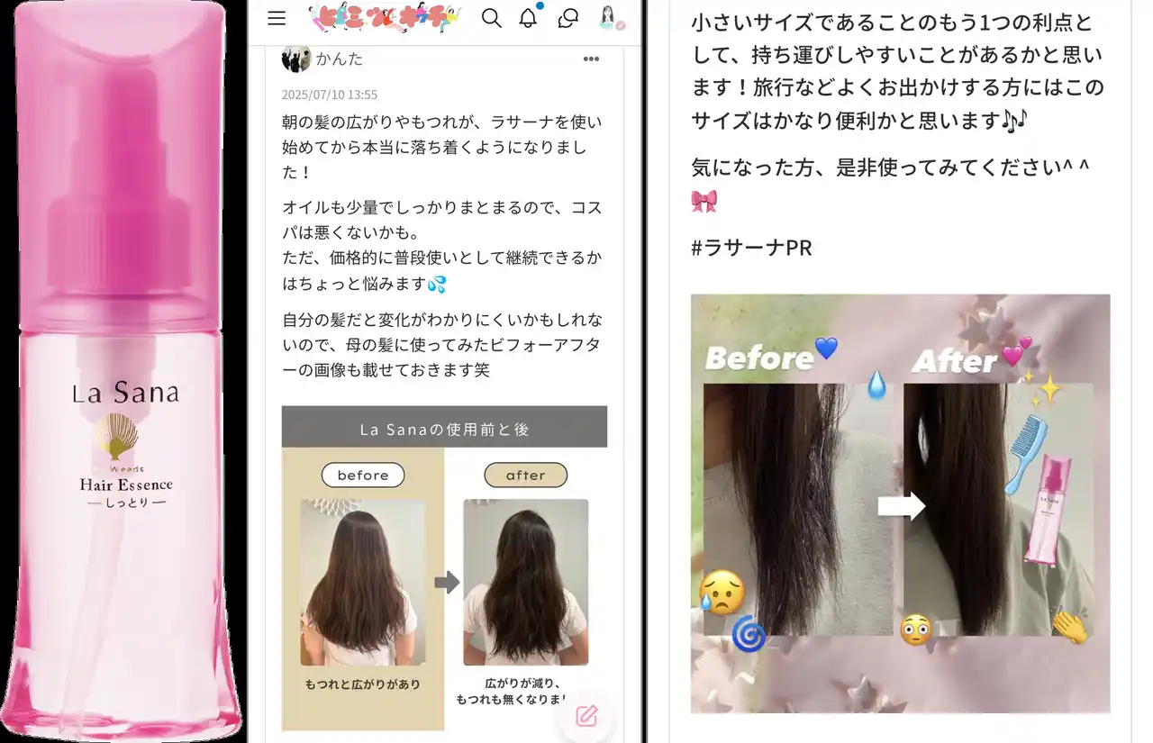 「ラララサーナ」は、ヘアケア・スキンケアブランド「La Sana(ラサーナ)」のアイテムをご愛用いただいている皆さんと一緒に創るコミュニティサイトです。美容に役立つTipsや、ここだけの限定イベント・キャンペーン情報をお届けするほか、写真投稿や掲示板を通じて、メンバーとの交流を楽しみながら、“きれい”やラサーナのこれからを一緒に創っていく場所です。 |