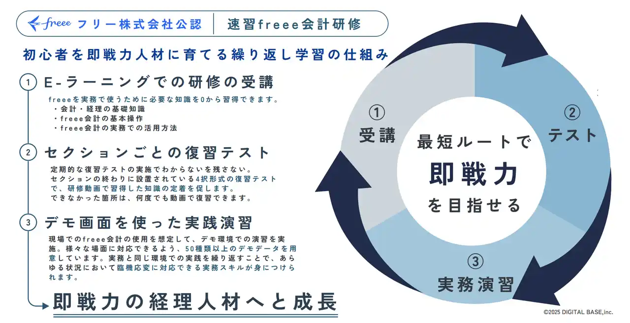 「速習freee会計研修」はDIGITAL BASEが提供・freeeが監修する、DX会計人材の育成をトータルサポートする研修プログラムです。受講者はe-learningを通じた座学研修、バーチャル環境上での実務演習、テスト受講を行い、1ヶ月程度の期間で完結します。freee会計を導入したものの活用しきれていない事務所や自己流の操作に不安を持つ方を主な対象としています。 |