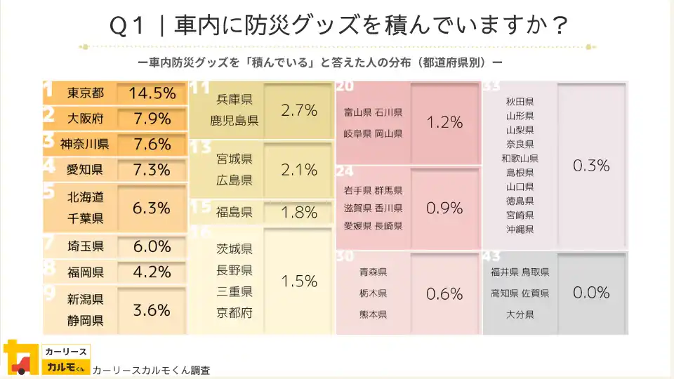 また、「神奈川県」「千葉県」「埼玉県」も上位7都道府県に入っており、1都3県で全体の34.4%を占めています。このことから、関東エリアは車の防災意識が高い傾向にあるといえそうです。 |