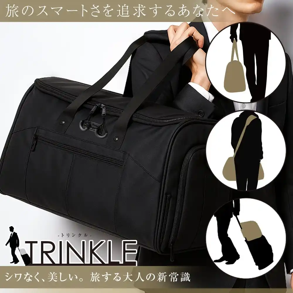出張や冠婚葬祭の度に悩まされるスーツのシワ。私たちはその悩みを解決するため、多機能ガーメントボストンバッグ「TRINKLE」を開発しました。バッグを180度開くと現れる、取り外し可能なガーメントケースに大切なビジネスウェアをセットし、そのまま持ち運べます。これにより、到着後にアイロンをかける手間が省け、第一印象を大切にしたい場面で役立ちます。 |