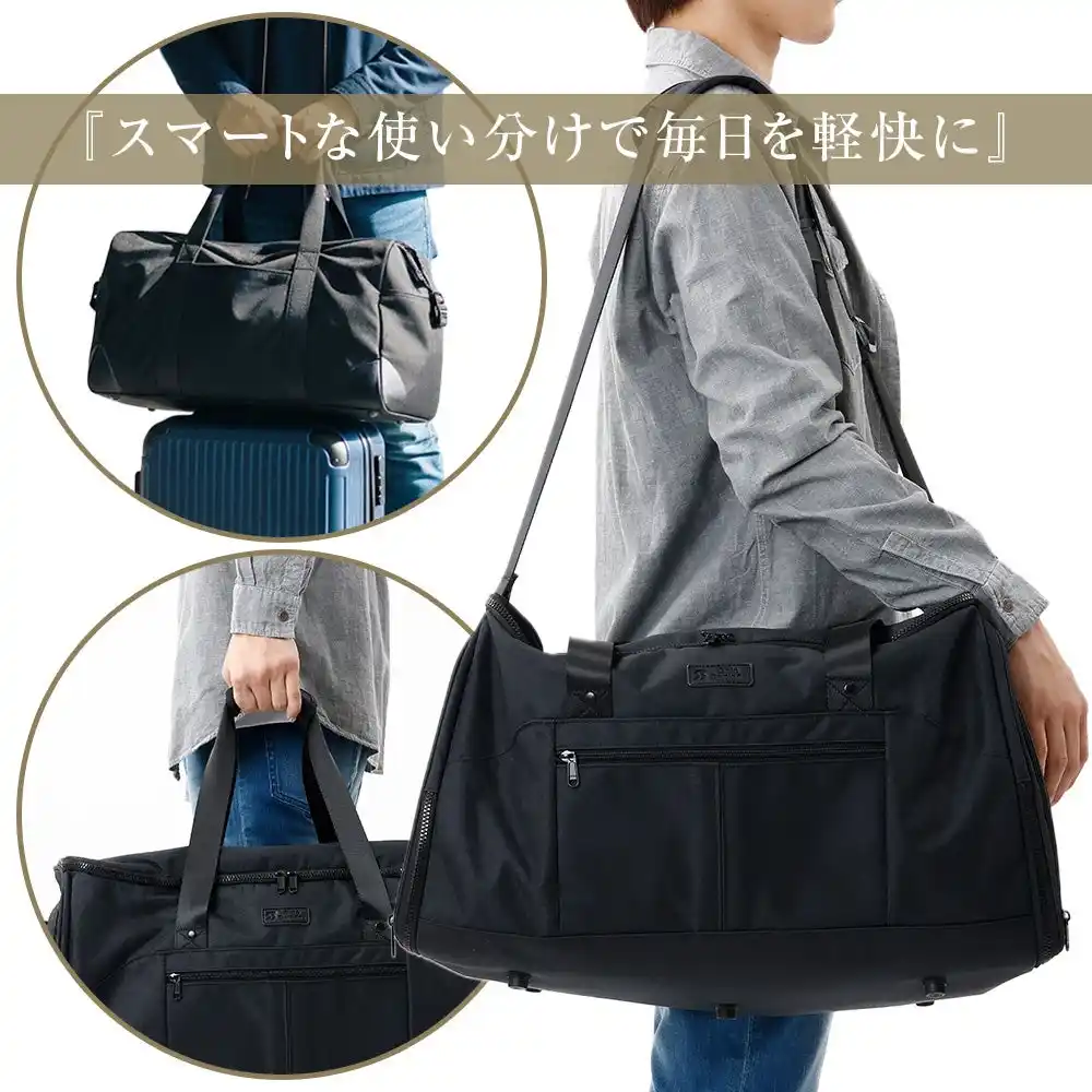 あらゆるシーンに対応する3WAY仕様 手持ち、ショルダー、そしてスーツケースに固定できるキャリーオンスタイルの3WAY仕様により、新幹線や飛行機、徒歩での移動まで、あらゆるシーンに柔軟に対応します。アクティブなビジネスパーソンに最適な、使い勝手の良さを追求しました。 |