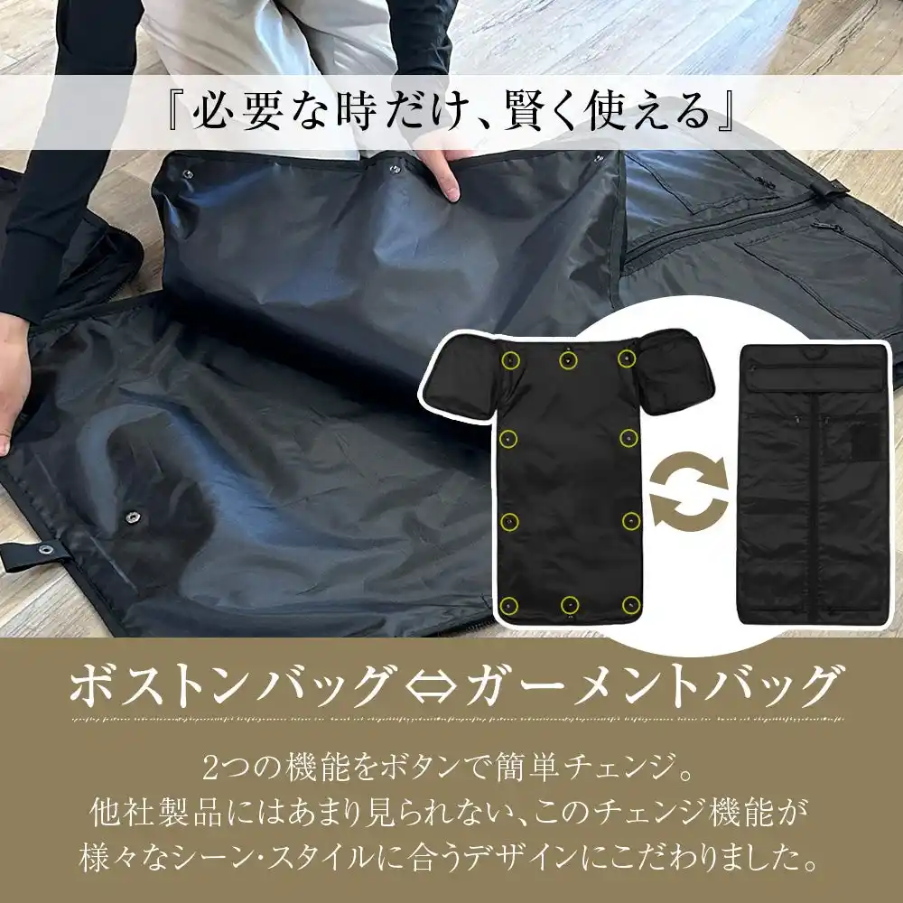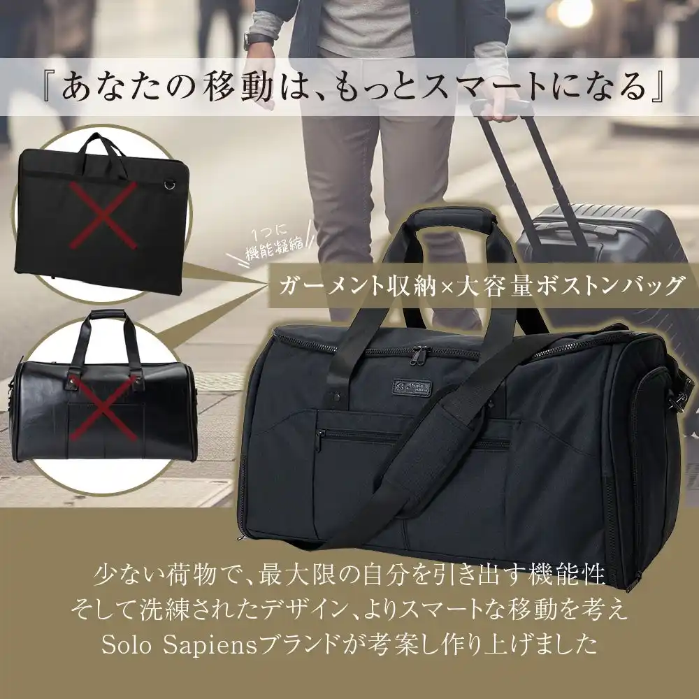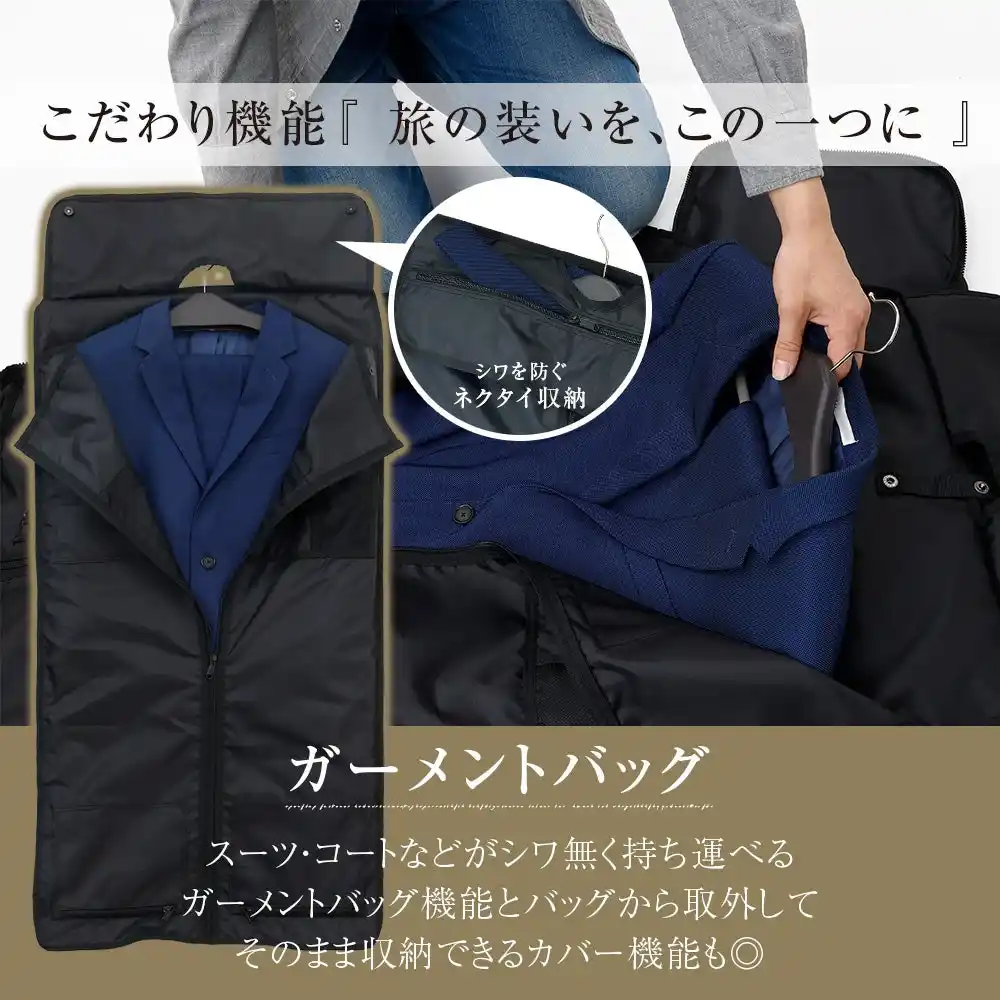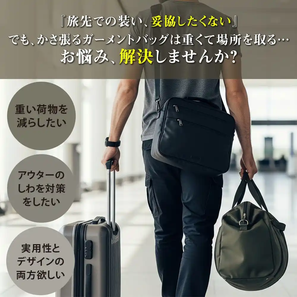 多くのビジネスパーソンが抱える「スーツのシワ」「荷物のかさばり」といった出張の悩みを解決するために開発された本製品は、大切なビジネスウェアをシワにすることなく持ち運べるガーメント機能を搭載。さらに、靴や小物もまとめて収納できる大容量設計で、出張時の移動をスマートかつ快適に変えます。 |