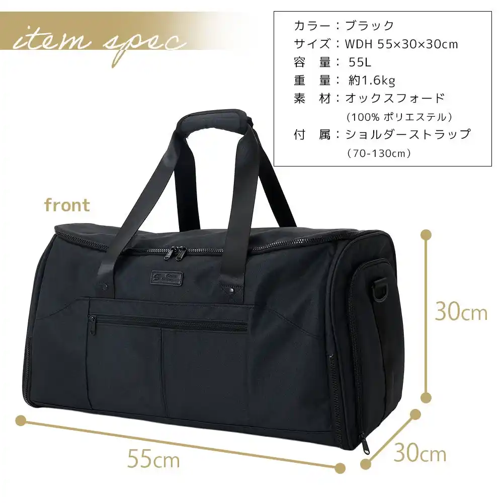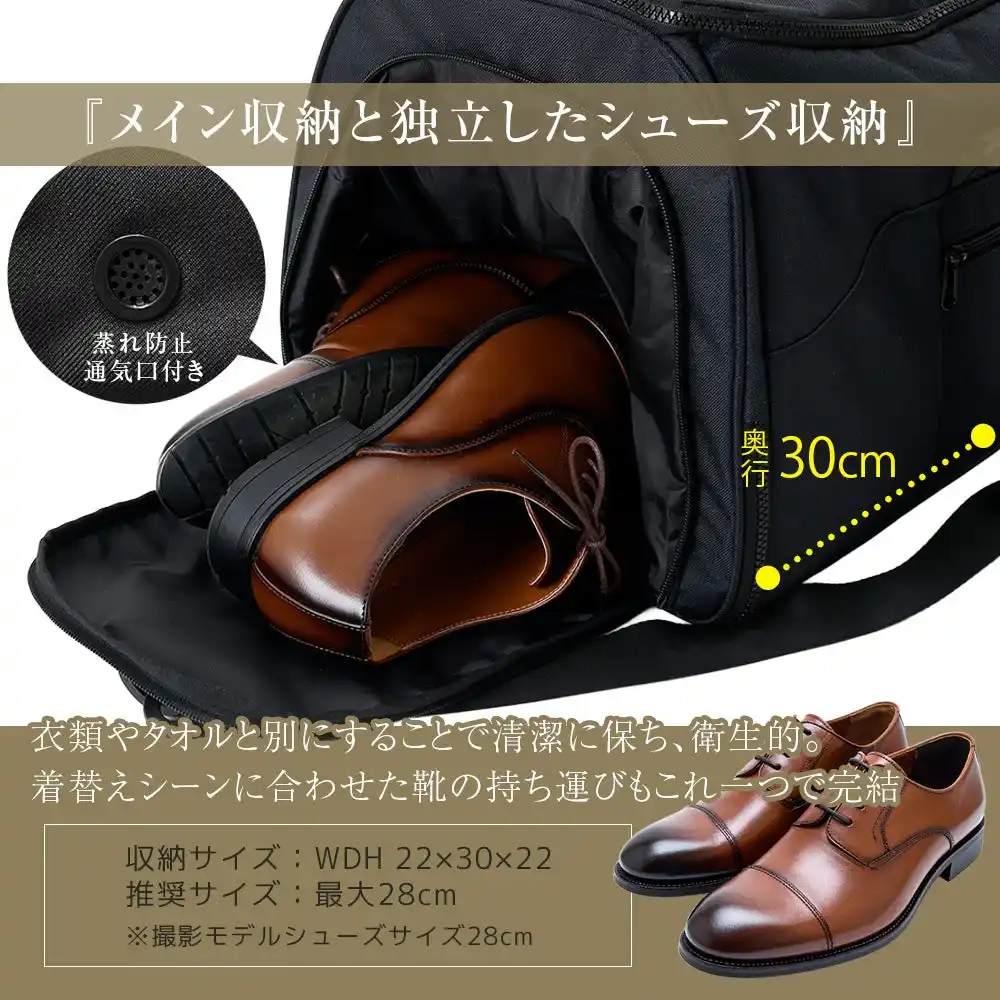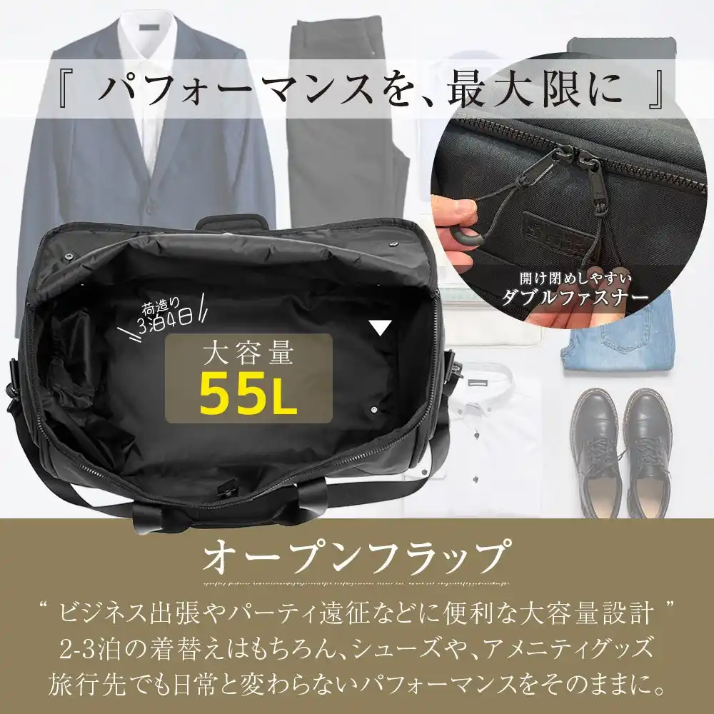 本製品は、出張や旅行に必要な荷物をすべて収納できる55Lの大容量設計です。スーツ、着替え、小物はもちろん、通気孔付きのシューズポケットに靴を分けて収納可能。複数のバッグを持つことなく、すべての荷物をこれ一つにまとめられます。 |