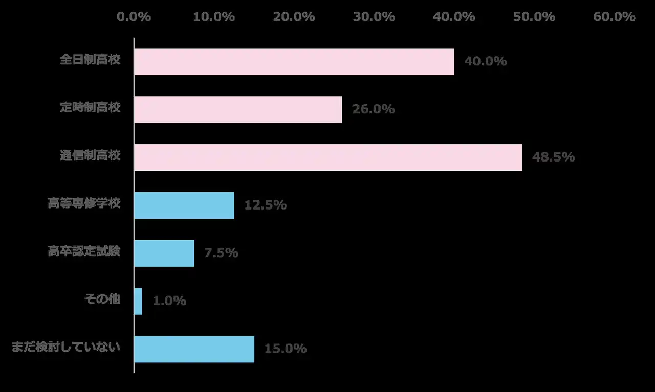 不登校の子どもを持つ家庭では、お子さまの状態や学び方に応じて、無理のないかたちで高校進学を検討する傾向が見られます。今回の調査では、通信制・定時制・全日制といった多様な選択肢が挙がり、特に通信制高校を検討している家庭が最も多い結果となりました。子ども一人ひとりに合った進路を模索する保護者の姿がうかがえます。 |