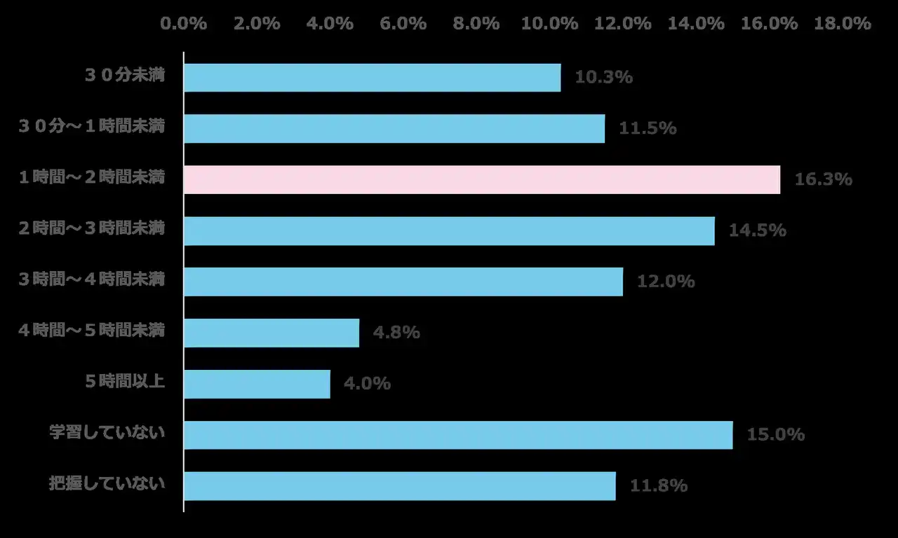 1日の平均学習時間について調査したところ、最多回答は「1時間~2時間未満(16.3%)」、次いで「学習していない(15.0%)」、「2時間~3時間未満(14.5%)」と続きました。また、「2~4時間学習している」と回答した家庭は全体の26.5%にのぼり、不登校の状況下でも一定の学習時間を確保している子どもが少なくないことがうかがえます。一方で、「学習していない(15.0%)」層も存在しており、学習習慣の有無には大きな個人差が見られました。 |