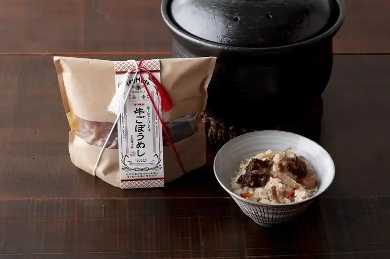 香川県産の牛すね肉を醤油と味醂で柔らかく炊いて、相性のよいごぼうと合わせた、肉のほろほろ食感が贅沢な牛ごぼうめしです。松山あげ、ニンジン、昆布と一緒に炊き込んでコクと旨みの炊き込みごはんをお愉しみください。 |