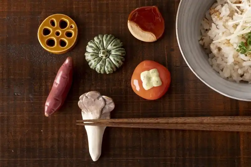 季節の箸置き(マイタケ・菊かぼちゃ・さつまいも・柿の実・くり・れんこん)各550円 美濃焼の「イホシロ窯」による手仕事。ひとつひとつ丁寧に細部までこだわり手づくりされています。秋の味覚をモチーフにした可愛らしいデザインで、食卓に季節を運びます。 |