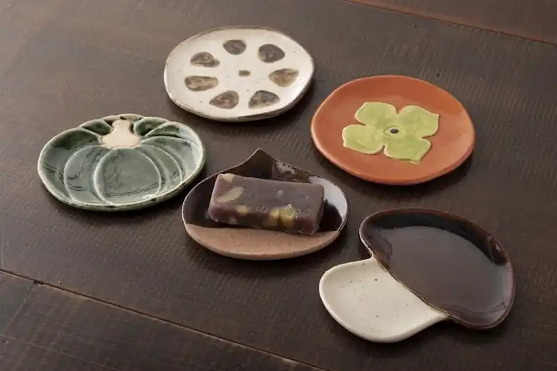 季節の豆皿(くり・れんこん・かき・きのこ・かぼちゃ)各1,320円 美濃焼の窯元「隆月窯」による手仕事。ひとつひとつ丁寧に細部までこだわり手づくりされています。秋の味覚をモチーフにした可愛らしいデザインで、食卓に季節を運びます。 |