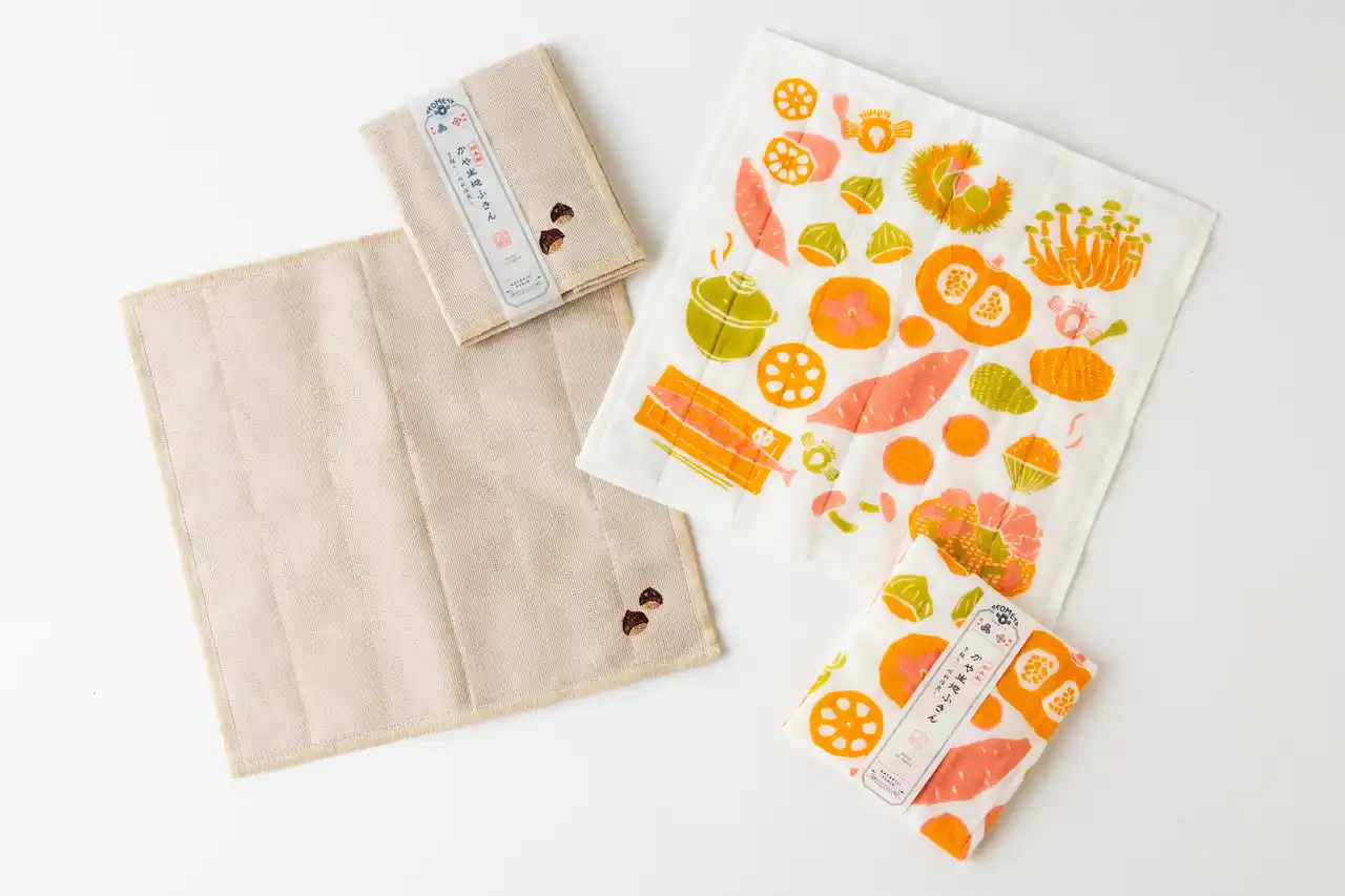 かや生地ふきん 秋プリント605円、栗刺繍715円 奈良県で織られた蚊帳生地を贅沢にも7枚重ねて作ったふきん。洗うたびにふんわりとした風合いになる蚊帳生地は、水をよく吸い、使うほどに手に馴染みます。毎日心地よく使用できるふきんです。季節限定デザイン。 |