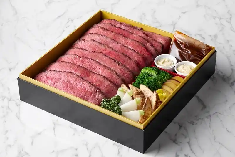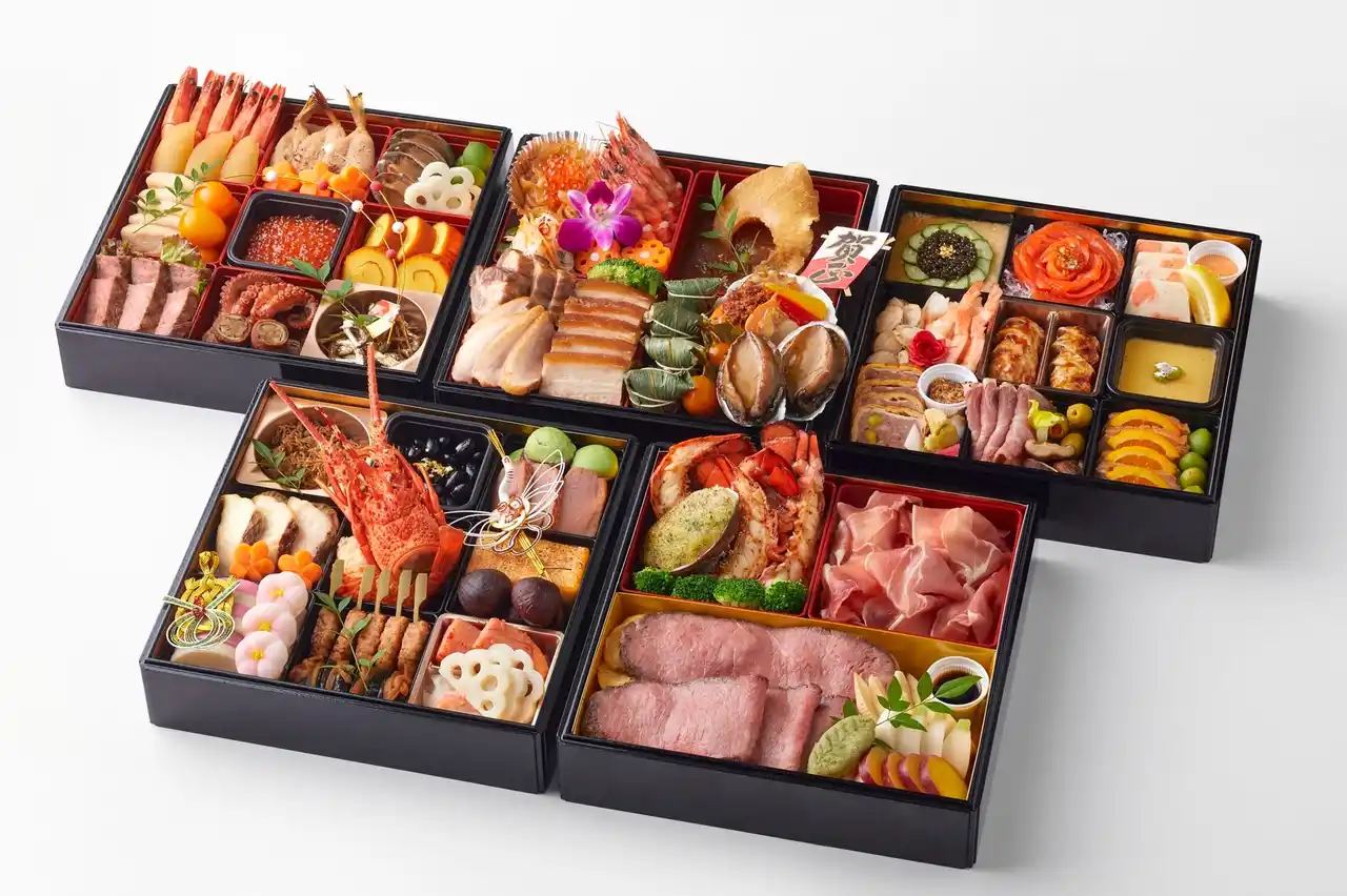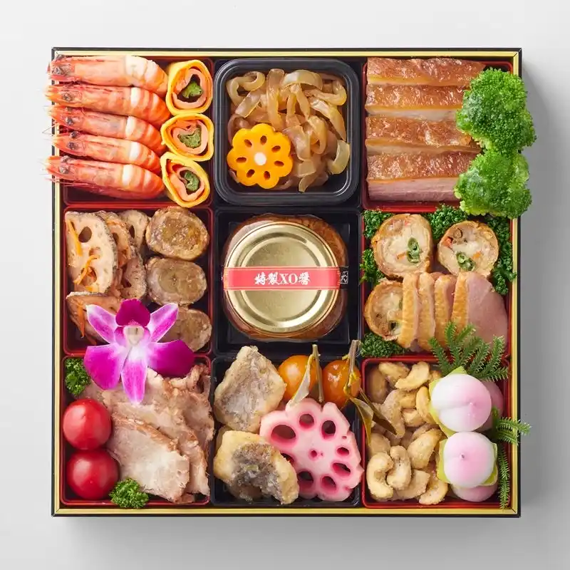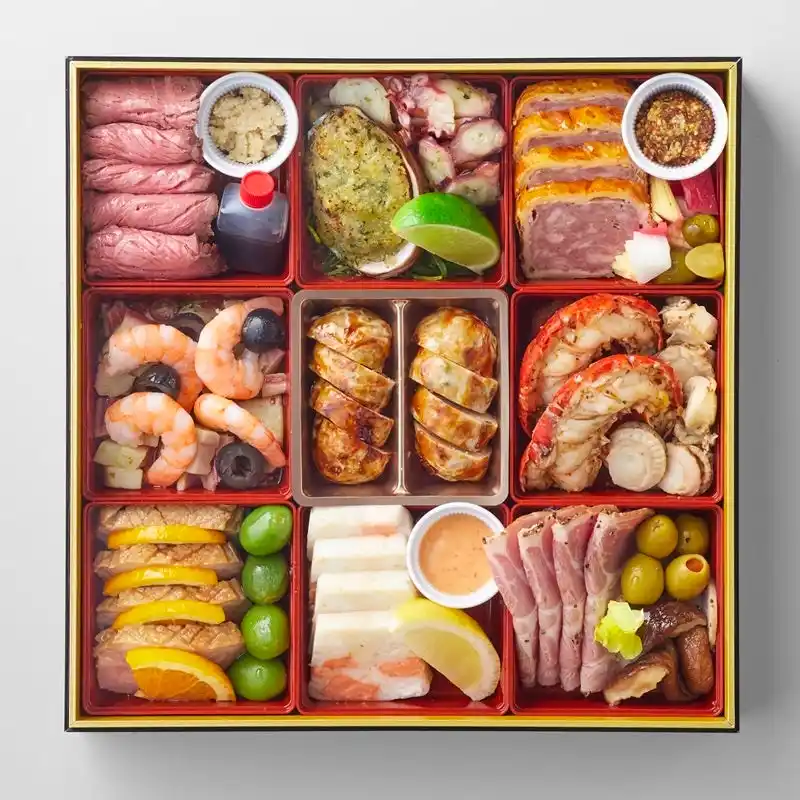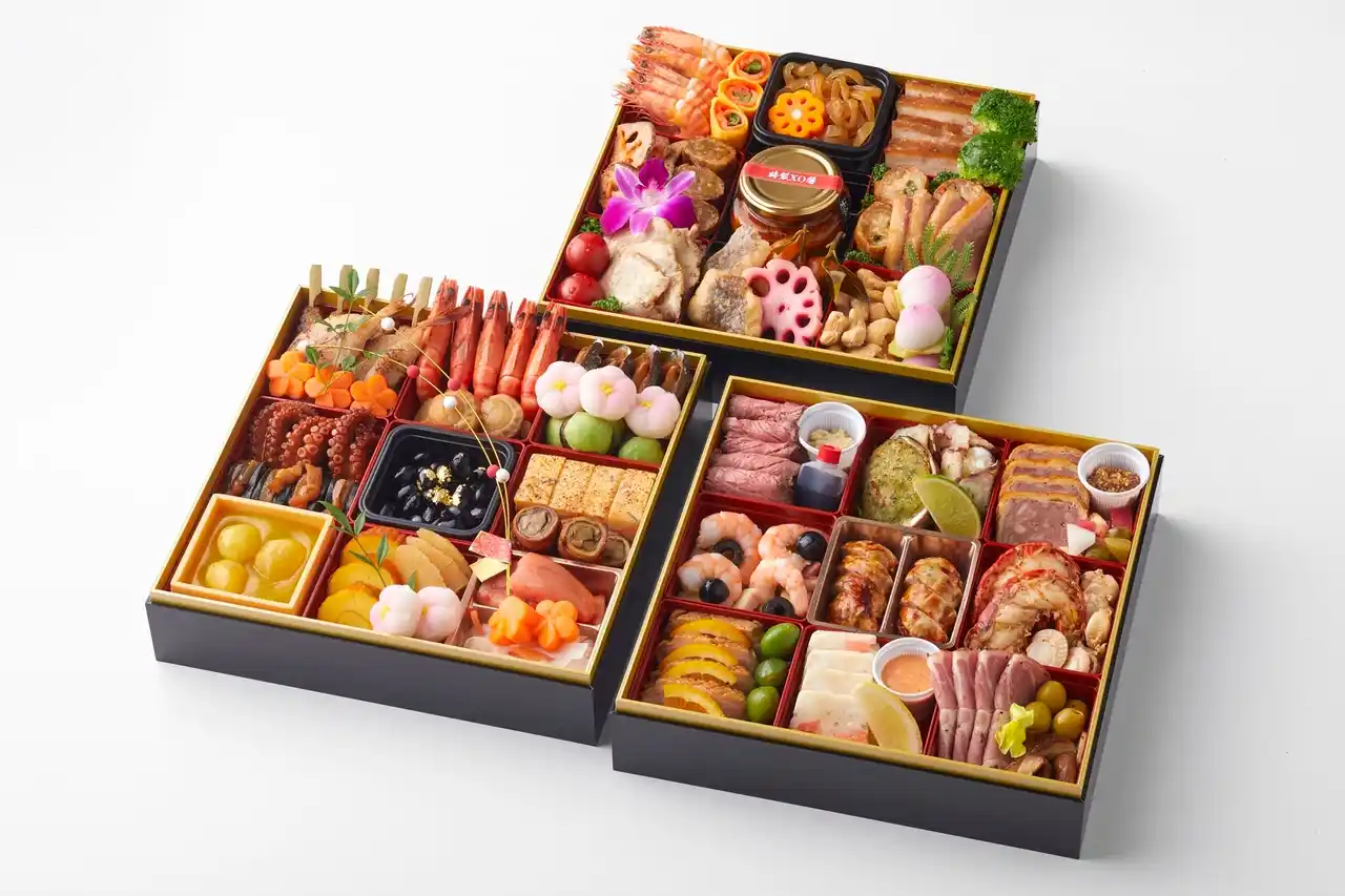 和・洋・中それぞれの料理長が趣向を凝らし、九州産黒毛和牛のローストビーフやフカヒレの姿煮など、贅を尽くした逸品を詰め合わせました。新春の食卓に、心躍る美味と華やぎをお届けいたします。 |