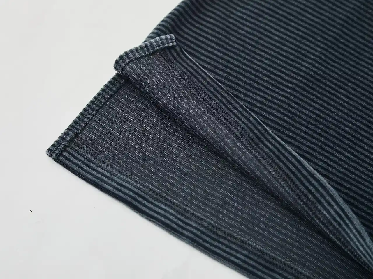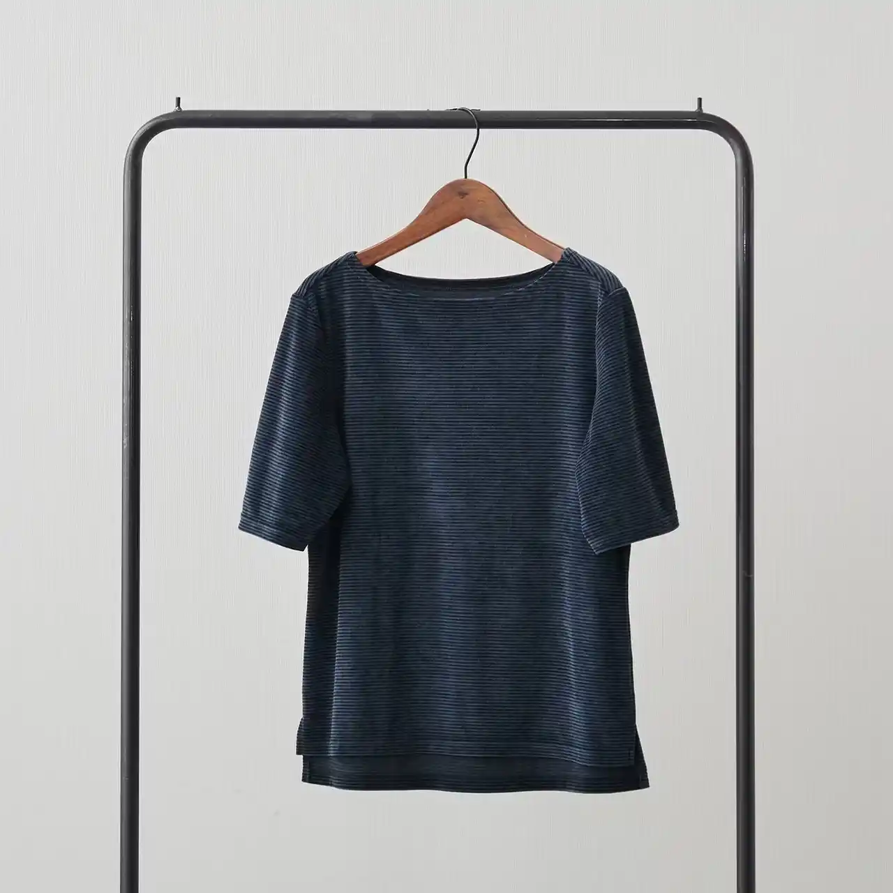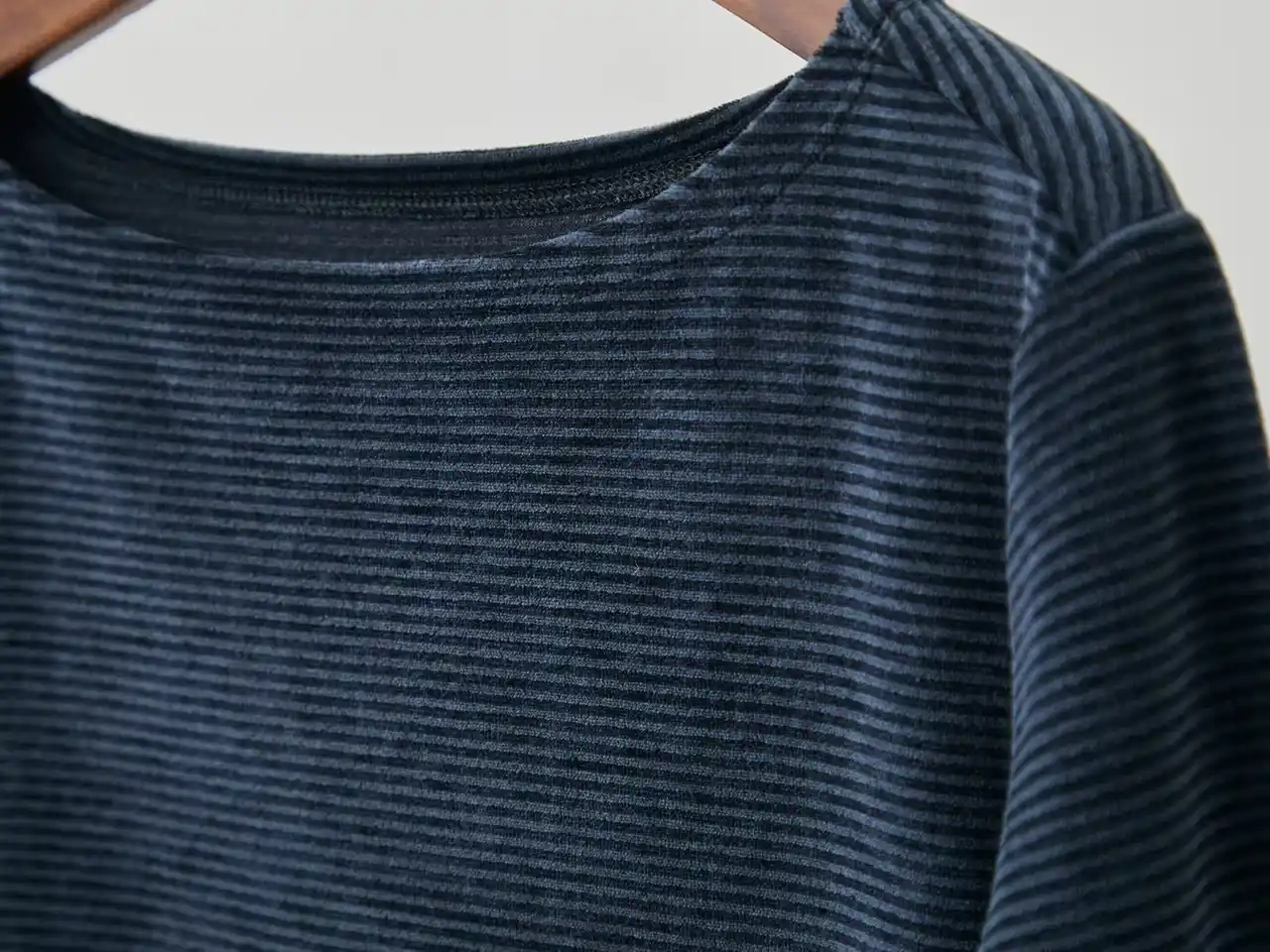 このTシャツに使われているのは、和歌山・高野口で丁寧に作られたシャーリングベロア。 上質なパイルカットソーにシャーリング加工を施すことで、表面はほどよくツヤを帯び、毛並みが美しく整っています。 着心地はとても軽く、ストレッチが効いていてラクチンです。 |