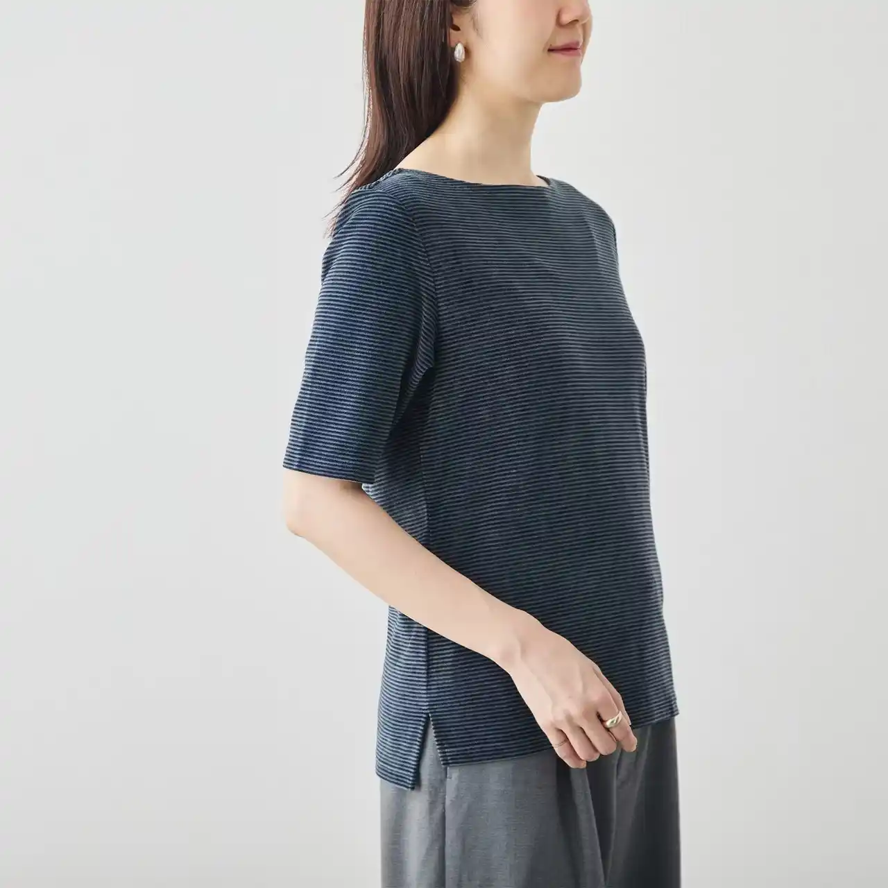 ネックラインは、華奢で女性らしい印象のボートネックを採用。 顔周りをスッキリと見せつつ、デコルテはカバーします。 クルーネックに比べてきちんと感があるので、きれいめなコーディネートにも合わせやすいです。 |