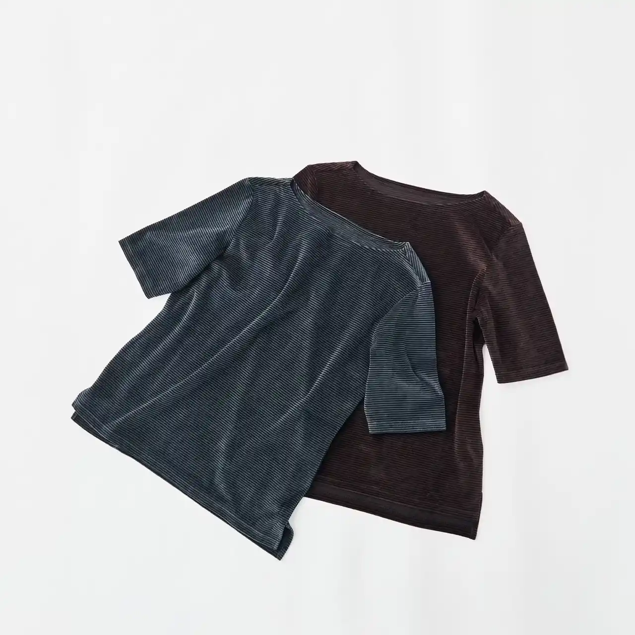 上品な光沢をまといながらも、日常にすっと馴染むシンプルなデザイン。 一枚でほどよい存在感を放ち、驚くほど軽やかな着心地は真夏でも快適。 淡い光をまとったようなベロアは、顔まわりを明るく映し、大人の装いにほどよい華やかさをプラスします。 |
