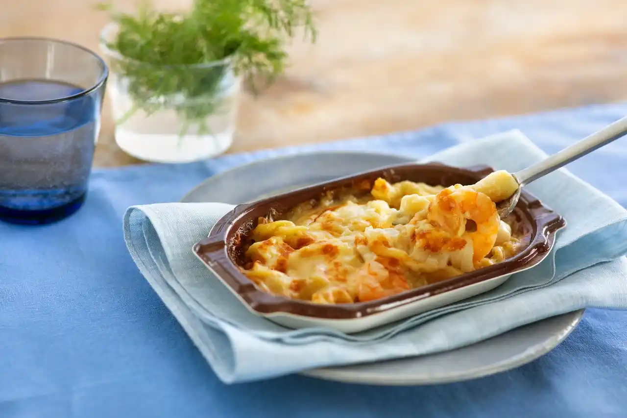自家製ホワイトソースに、海老・イカ・小柱の3種のシーフードをあわせた、深い味わいのグラタンです。 |