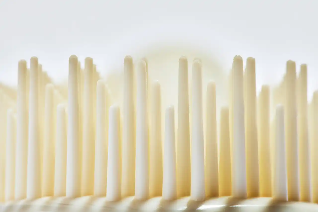 クオリタス ヘアブラシ独自のピン配列は、髪の絡まりを無理なくときほぐします。3種類のピン構造になっており、髪に触れる長いピンの数を最も多く配置。力を分散させることで地肌を傷めずに髪をほどきます。さらに、ブラッシングの圧がかかりやすい手元側は細いピン、力が伝わりにくい先端側はあえて太いピンに設計することで、均一で心地よい刺激を実現。ピンの根本を滑らかなアール形状にすることで、髪と頭皮への負担を極限まで減らしました。 |
