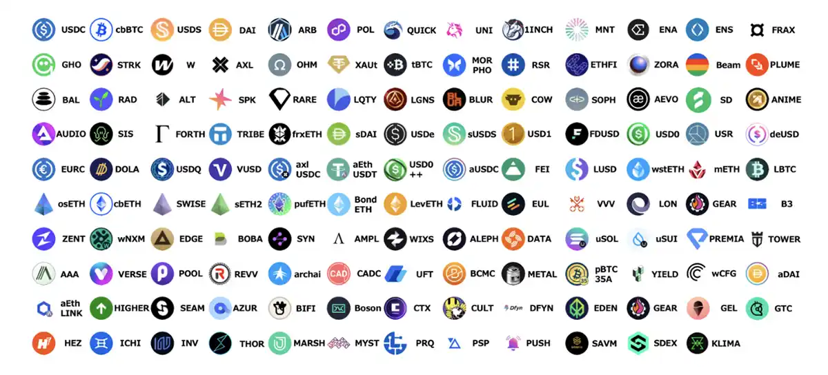 また、以下の129種類の暗号資産については、新ウォレットアプリからステーブルコインを利用して外部DeFiサービスで取引を行う場合、ガスフィー(ネットワーク手数料)無料で取引出来る予定です。対象暗号資産は対応ブロックチェーン追加に合わせて、順次拡大予定です。現時点での対象ステーブルコインは主にUSDCを想定しておりますが、今後は対象ステーブルコインを拡大予定です。 |