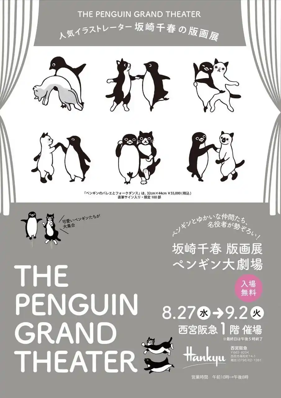JR東日本ICカードのキャラクター「Suicaのペンギン」や、千葉県のマスコットキャラクター「チーバくん」など、多くの人に愛されるキャラクターを生み出し続ける坂崎千春さん。この度、西宮阪急で2回目の版画展を開催いたします。会場は表情豊かなペンギンたちが躍動感溢れるシーンを演出し、そこはまるで大劇場のよう。約120点もの作品の数々に心躍ります。また、毎回大人気のペンギングッズや今回新作登場する『ペンギン大劇場グッズ』(※8月30日より発売予定)も、お楽しみポイントに。 |