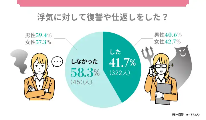 パートナーに浮気されたことがある既婚者男女772人に「浮気に対して復讐や仕返しをしたか」聞いてみたところ、したと回答した人は41.7%でした。 |