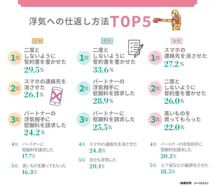 浮気へ復讐した322人に「仕返し方法」について聞いたところ、男女合わせた1位は「二度としないように誓約書を書かせた」でした。 |