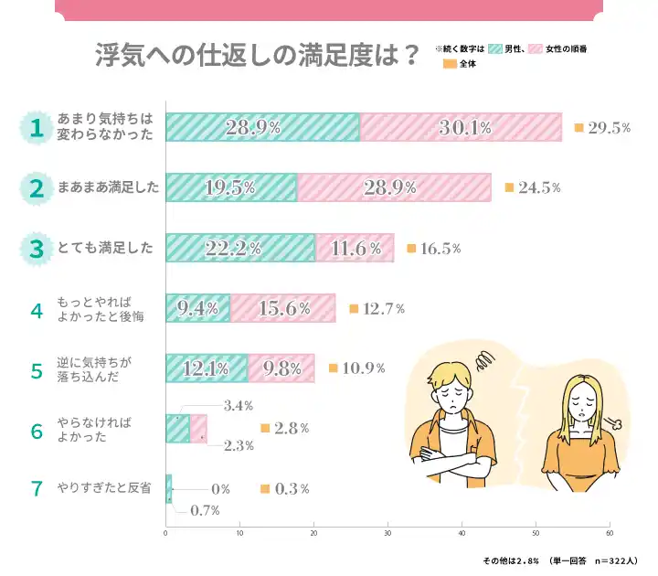 浮気へ仕返しした満足度は「あまり気持ちは変わらなかった」が1位 |