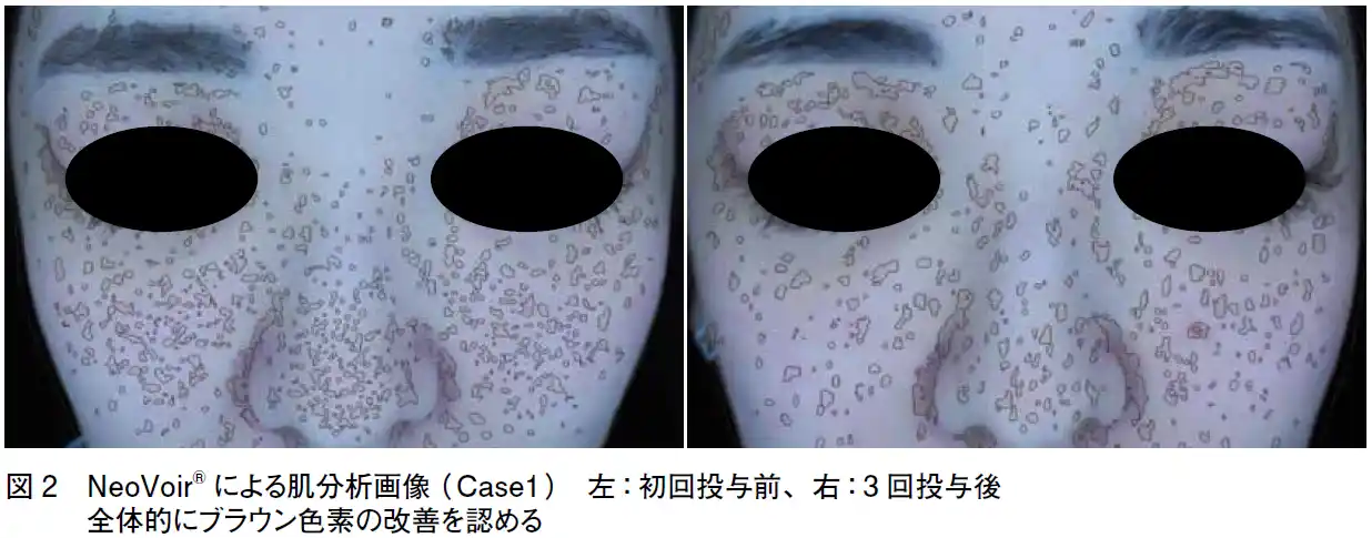 | 5名の女性に対し、右顔面にECM製剤、左顔面にPN製剤を2週間おきに各3回投与した。評価は肌診断機NeoVoir(R)を用い、シワ、赤み、ブラウン色素、皮膚トーン、毛穴の5項目について治療前後で比較を行った。 | |||||||||||||||||||||||||||||||||||||||||||||||||