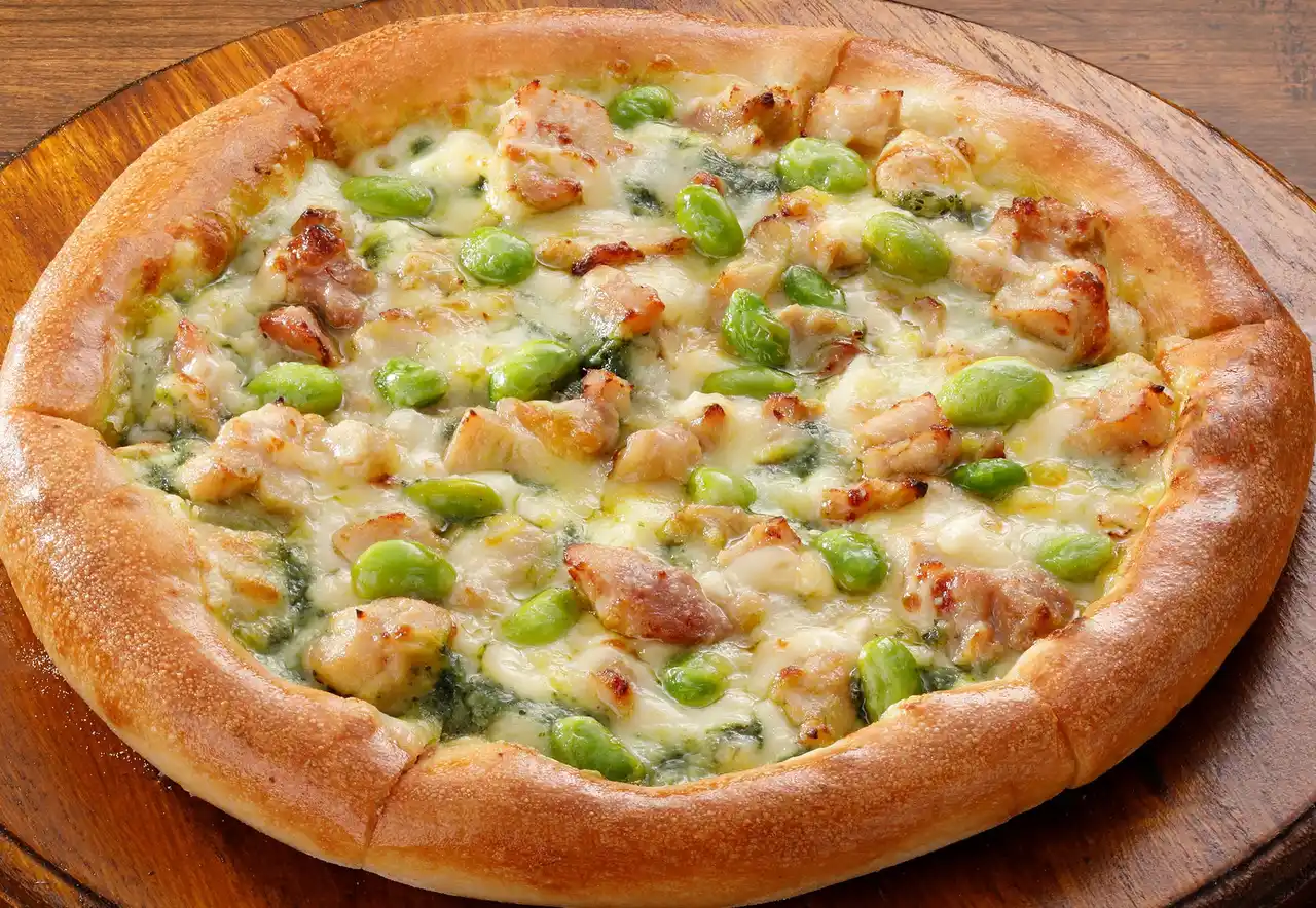 特製チキン・枝豆・プレミアムチーズブレンド・エキストラチーズ・バジルソース・マヨネーズ |