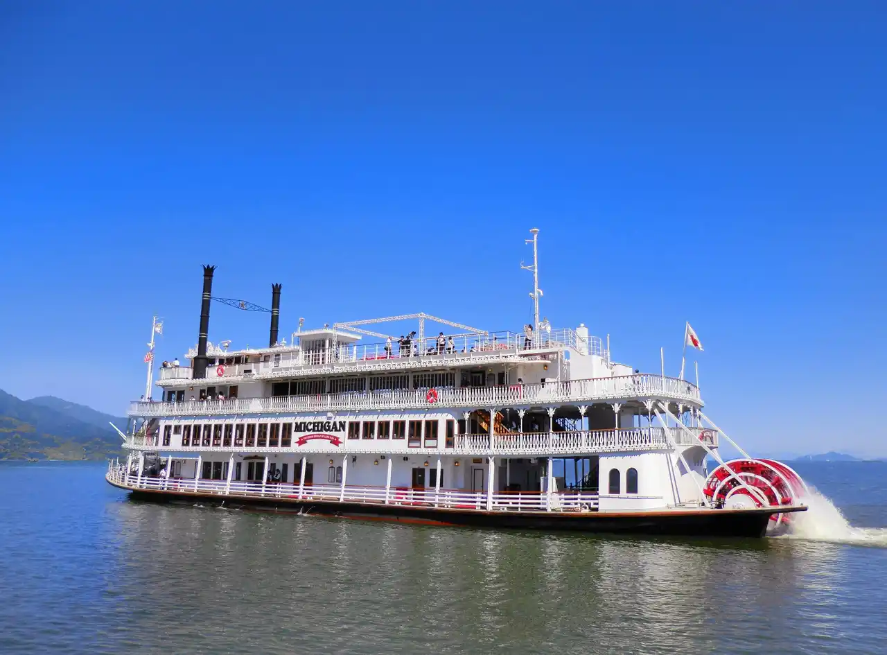 びわ湖の南部を周遊する陽気な外輪船「ミシガン」に乗船するアクティビティ。デッキからは雄大なびわ湖の景色を一望できるほか、船内では楽しい観光案内や音楽ライブショー、多彩な食事が楽しめます。有害ガスやCO2の排出を抑えるなど、びわ湖の豊かさを未来へつなぐ取り組みにもご注目ください。 |