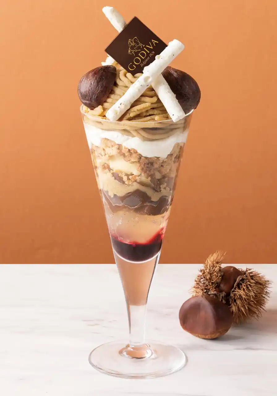 【ゴディバ ジャパン株式会社】 GODIVA cafe限定、注目のシェフとの3連続コラボレーションパフェ企画スタート! 第1弾「秋栗とショコラのモンブランパフェ」登場