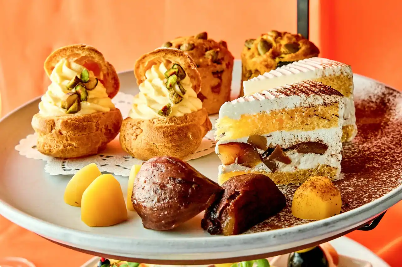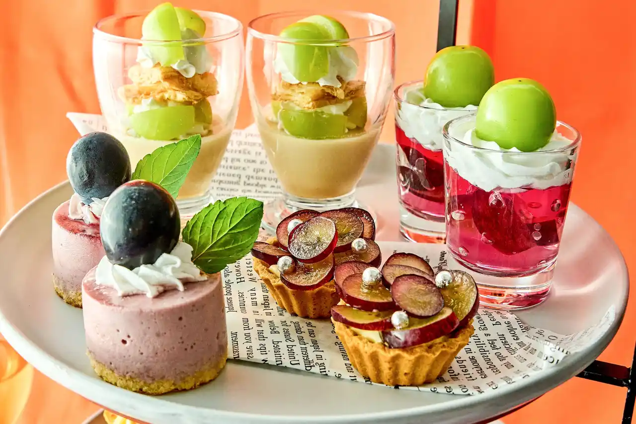 みずみずしくジューシーな葡萄と、栗やかぼちゃなど秋の味覚が織りなす、季節の恵みを贅沢に取り入れたアフタヌーンティー。ひと皿ごとに秋の移ろいを感じさせる華やかなラインナップは、心満たされるひとときを演出いたします。上段には、シャインマスカットのフレッシュな味わいと、香ばしいほうじ茶の香りがマッチしたパンナコッタや、長野県のオリジナル品種で糖度の高いナガノパープルをのせたジューシーな味わいが楽しめるタルトなどをご用意。中段には、かぼちゃのゴロゴロした食感とシナモンが香る素材の甘さを生かした、秋らしい味わいのかぼちゃのスコーンのほか、ナガノパープルが一粒まるごと入ったプチシューなどが並び、贅沢な味わいが楽しめます。 |