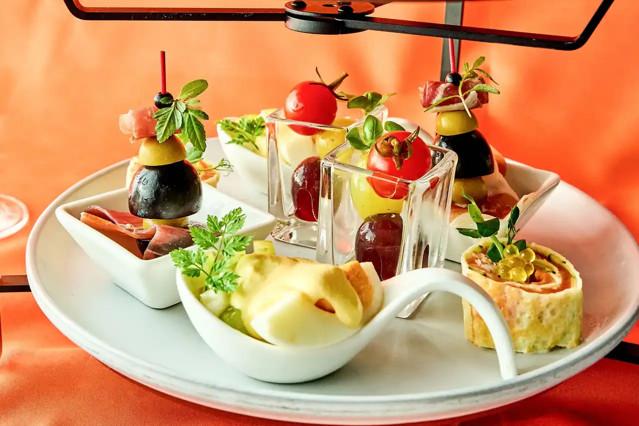セイボリーは、シャインマスカットの甘みを加えたポテトサラダに、川崎産の濃厚な卵とオランデーズソースを纏わせた、フランス料理の定番“ウフマヨ”をアレンジ。果実の爽やかな甘みと卵の豊かなコクが織りなす、まさかの組み合わせが、驚きと感動をもたらします。さらに、濃厚なカニとクリームチーズをたっぷりと包み、香り高いスモークサーモンを重ねた贅沢なクレープロールは、ひと口ごとに広がる旨みとクリーミーなコクが、口の中でとろけるように調和する、見た目にも華やかな一品です。 |