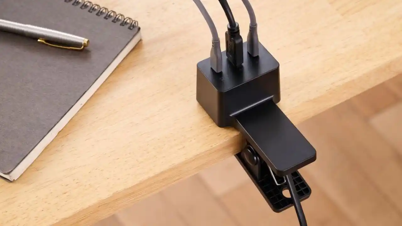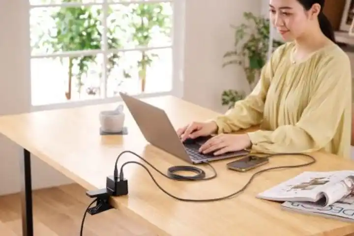 机などに挟んで使えるクリップ機構を搭載した、USB Type-CポートとUSB-Aポート付きのAC充電器です。 |