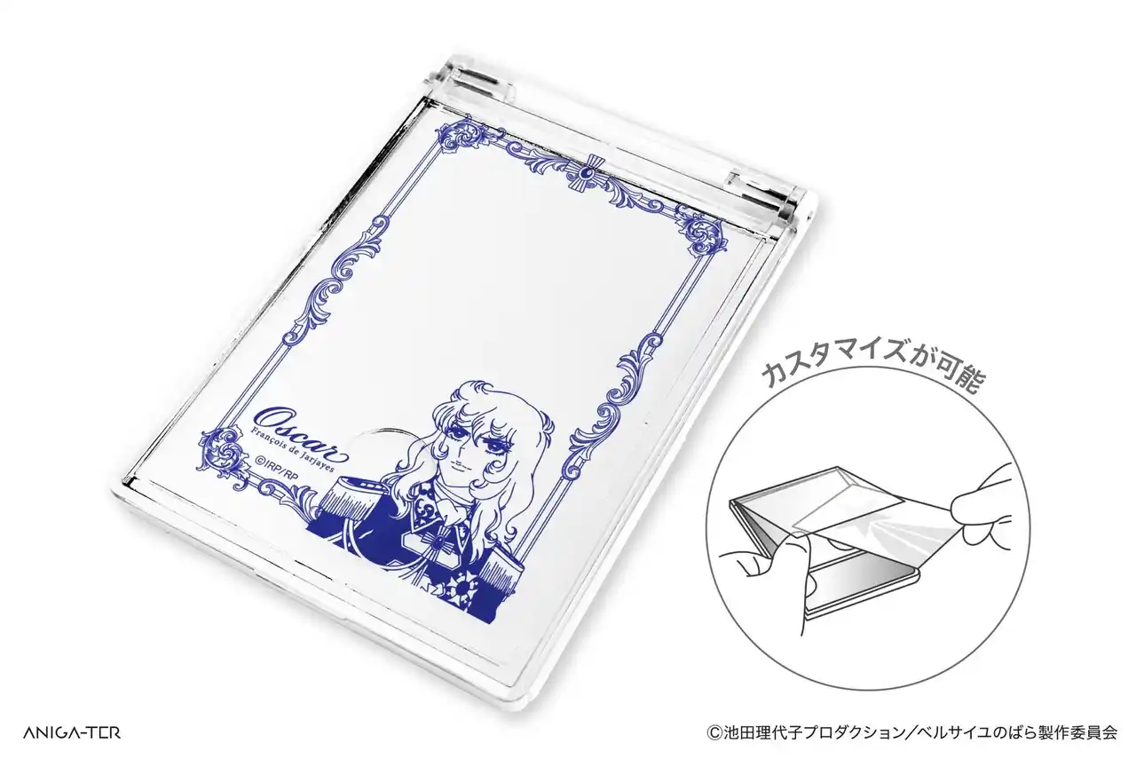 蓋の部分は、アンティーク調の額縁と「オスカル・フランソワ・ド・ジャルジェ」のイラストをロイヤルブルーでプリント。お手持ちのトレーディングカードや別売りの場面写ステッカーを入れてカスタマイズも楽しめます。 |