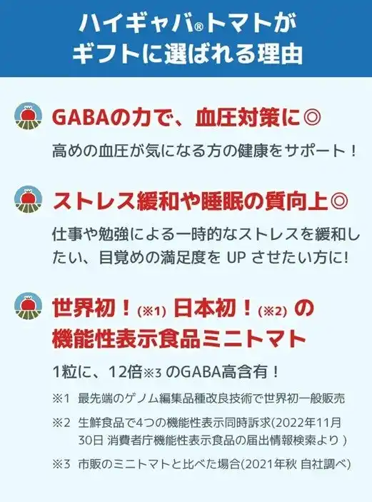 ハイギャバ(R)トマトは、一般的なミニトマト12倍(※1)GABAが高蓄積された世界初(※2)、日本初(※3)の機能性表示食品のミニトマトです。 |