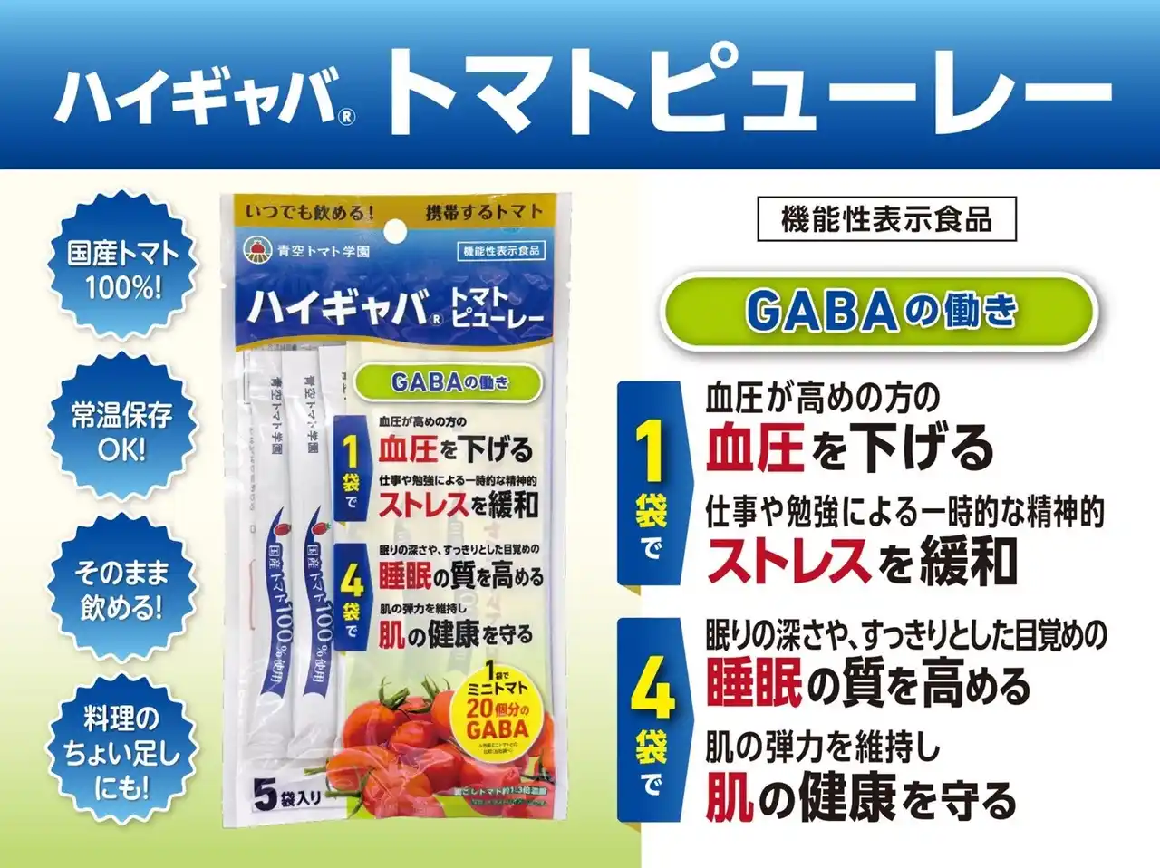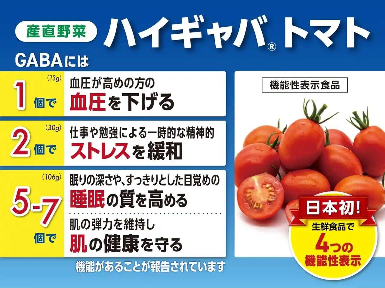ハイギャバ(R)トマトは、一般的なミニトマト12倍(※1)GABAが高蓄積された世界初(※2)、日本初(※3)の機能性表示食品のミニトマトです。