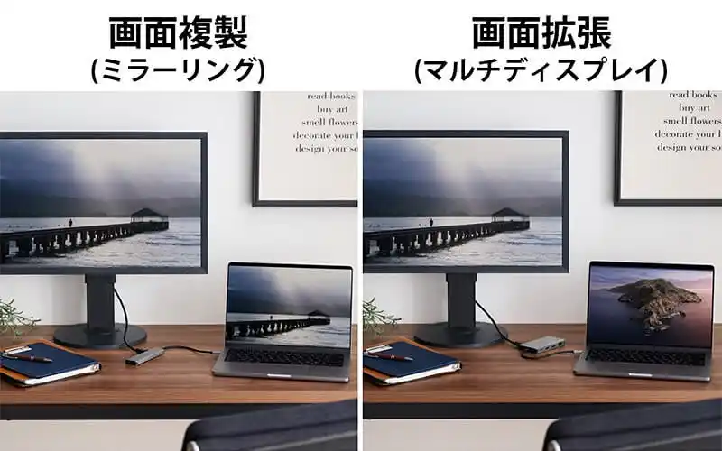 パソコンの画面と同じ映像を表示する画面複製(ミラーリング)と、作業エリアが広がる画面拡張(マルチディスプレイ)に対応します。 |