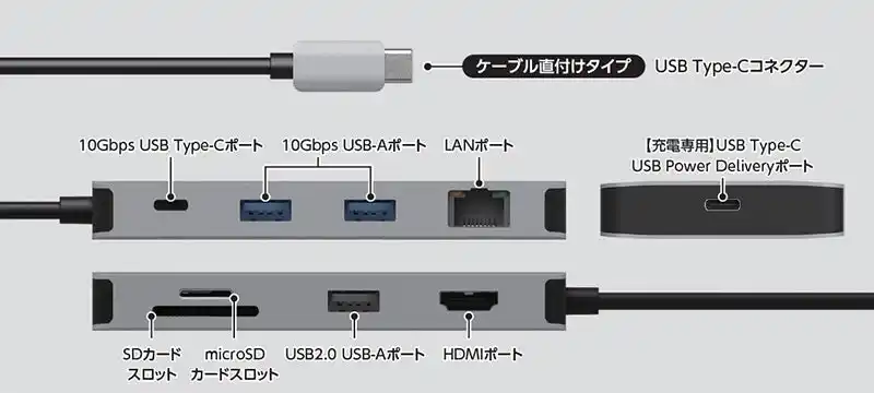 ドッキングステーションとしての基本機能を備えた5ポートモデルと、カードスロットや有線LANポートも装備した9ポートモデルをご用意しています。 |
