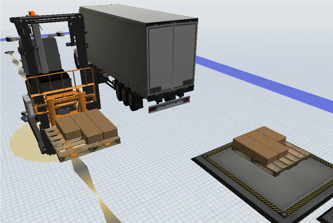 本展示会において当社は、各共同出展社様と連携し、3Dシミュレーションソフト「FlexSim」を活用した実際のトラック・ロボット・AGF(無人搬送フォークリフト)と連動したデジタルツインのデモを共同出展します。 |