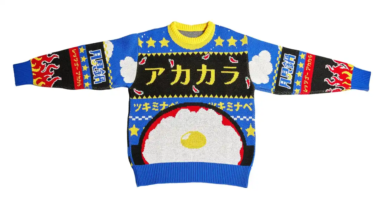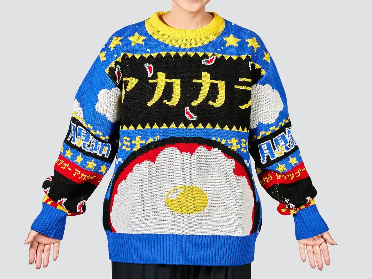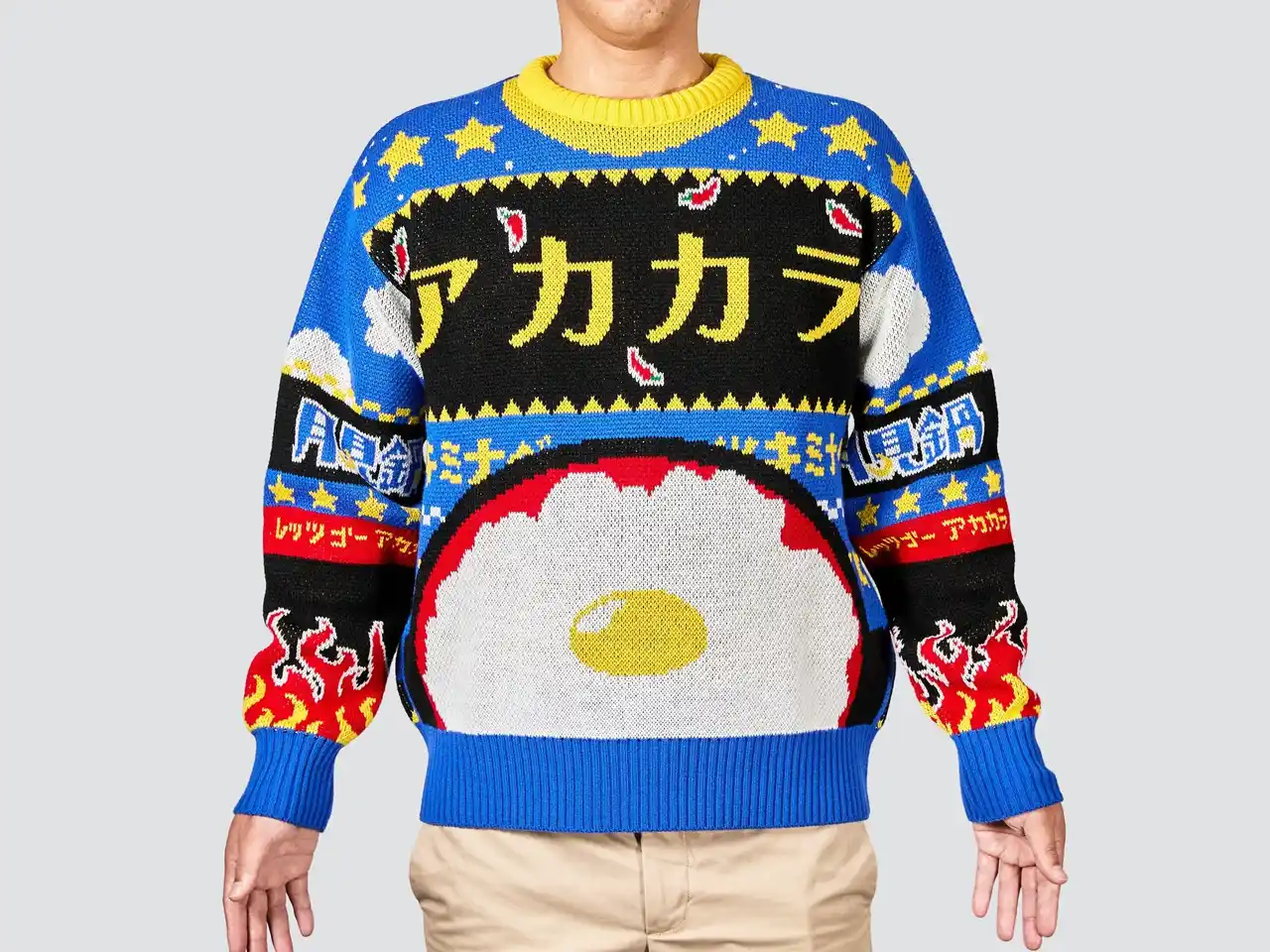 「月見フェア」でのキャンペーン用の特典としてインパクト大の赤からオリジナルセーター、その名も「月見ダセーター」を製作。欧米のクリスマスシーズンにあえて“ダサい”セーター「アグリーセーター」を着て楽しむ文化から着想を得ています。赤からのロゴやフェアのメイン商品「赤から月見鍋」のモチーフが大胆に配置されたデザインは一度見たら忘れられない強烈な印象を与えます。思わずクスッと笑ってしまう“ダサい”セーターを着て、気の合う仲間と楽しい時間を過ごして欲しい!そんな想いが「月見ダセーター」には込められています。 |