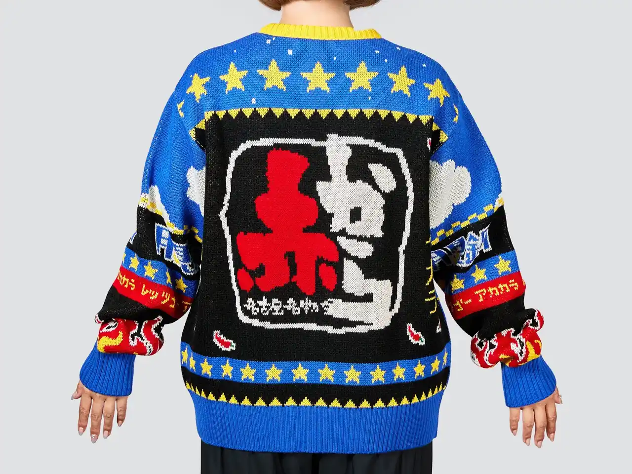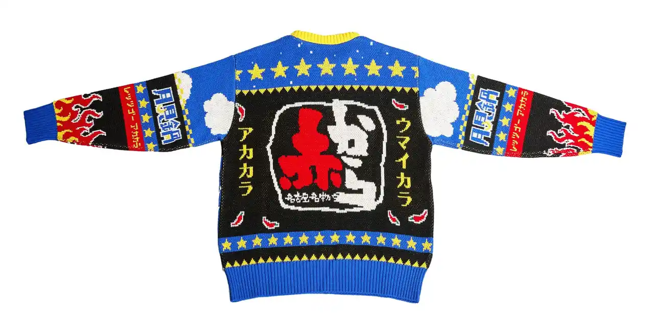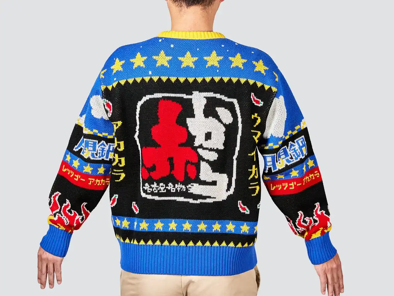 「月見フェア」でのキャンペーン用の特典としてインパクト大の赤からオリジナルセーター、その名も「月見ダセーター」を製作。欧米のクリスマスシーズンにあえて“ダサい”セーター「アグリーセーター」を着て楽しむ文化から着想を得ています。赤からのロゴやフェアのメイン商品「赤から月見鍋」のモチーフが大胆に配置されたデザインは一度見たら忘れられない強烈な印象を与えます。思わずクスッと笑ってしまう“ダサい”セーターを着て、気の合う仲間と楽しい時間を過ごして欲しい!そんな想いが「月見ダセーター」には込められています。 |