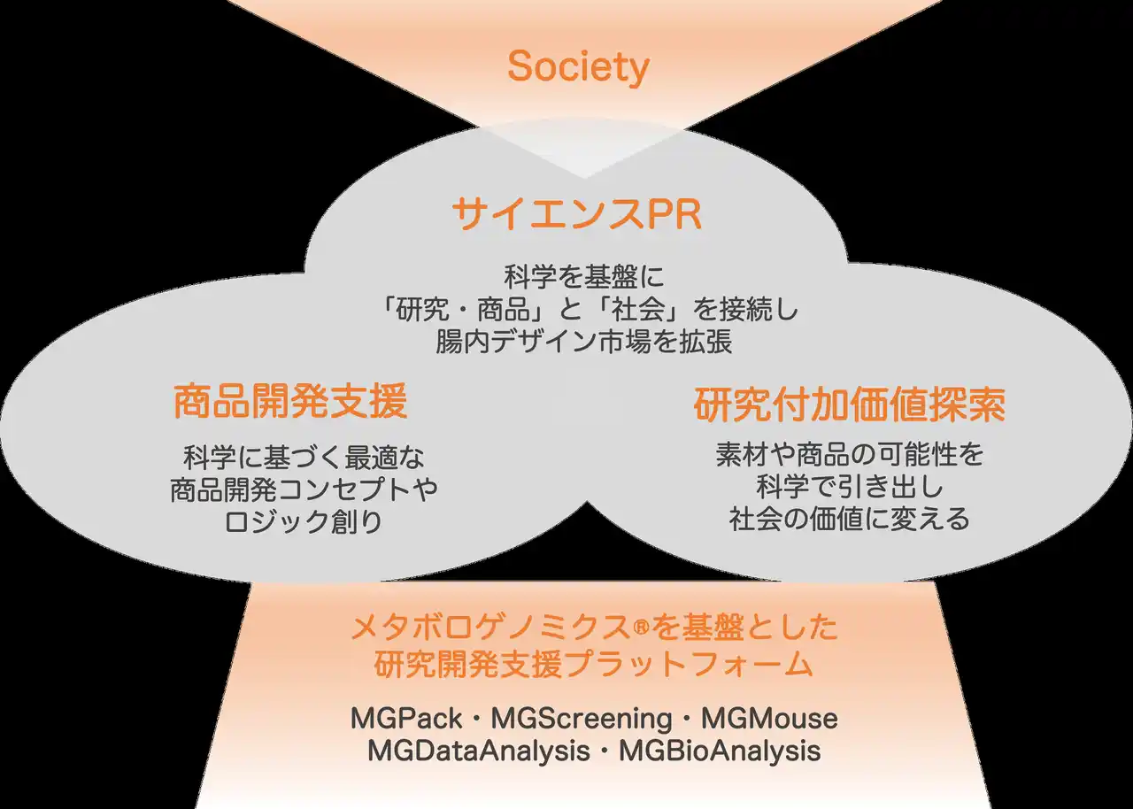 <コアサービス> ●受託分析 糞便試料を用いた腸内細菌叢や腸内代謝物質分析など、当社が蓄積してきたサンプル処理技術を活かした分析を行い、測定データを提供します。 ●産学連携支援 産学連携プロジェクトにおける共同研究に際して、試験設計・実験・解析・論文化等の過程で必要となるサポートを行います。メタジェンの研究基盤とネットワークを活かし、ご要望に応じて研究の社会実装や企業とのマッチング機会のご相談も承ります。 ●エビデンス創出支援 企業等が開発中の素材や製品を対象に、当社の研究開発支援プラットフォームを活用し、腸内環境を含む生体系への影響評価を通じて、科学エビデンスの創出を支援いたします。 ●外部資金獲得支援 企業等が実施したい研究(事業)開発に対し、研究計画実行に向けた外部資金を獲得するための支援を行います。 |
