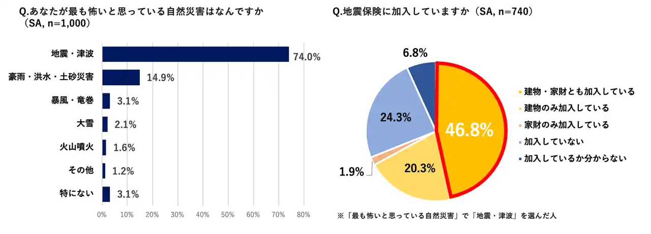 しかし、その「地震・津波」が最も怖い自然災害と回答した人においても、建物と家財の双方を補償する地震保険への加入率は46.8%と半数に満たない状況であることが明らかになりました。さらに、24.3%が未加入、6.8%が加入状況を把握していないと回答しており、3割以上(31.1%)が無保険またはそれに準ずる状態にあることが明らかになりました。地震の甚大なリスクを理解し、最も恐れるべき災害だと認識しているにもかかわらず、“経済的備え”が追いついていない現状がうかがえます。 |