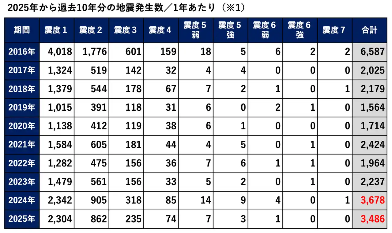 気象庁によると(※1) 、2024年の地震発生数は3,600回を超えており、熊本地震が発生した2016年に次いで過去10年で2番目に多い年になりました。2024年は震度7を観測した能登半島地震や、震度6弱を観測した豊後水道地震、その他にも震度5強が9回、震度5弱が14回と規模の大きい地震が相次いで発生しました。 |