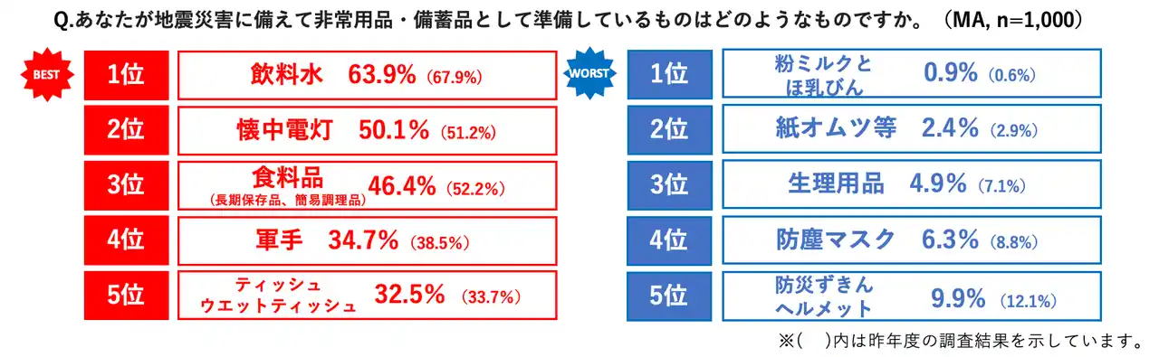 地震災害への備えとして非常用品・備蓄品の準備状況を調査したところ、「飲料水」(63.9%)が2年連続で最も多く、次いで、停電時に必須となる「懐中電灯」(50.1%)、非常時の栄養補給を支える「食料品」(46.4%)が続きました。これらの結果から、断水や停電といったライフラインの寸断を想定した、災害直後に必要となる基本的な備えが多くの家庭で浸透している状況がうかがえます。その一方で、「いずれも準備していない」との回答も19.2%にのぼり、前年(16.8%)から2.4%増加しました。約5人に1人が防災用品を全く備えていない実態が明らかになりました。 |